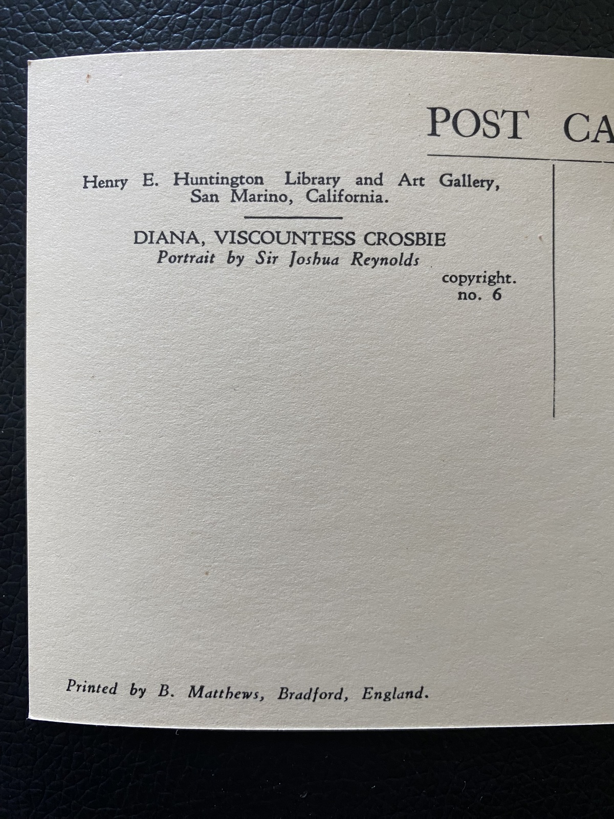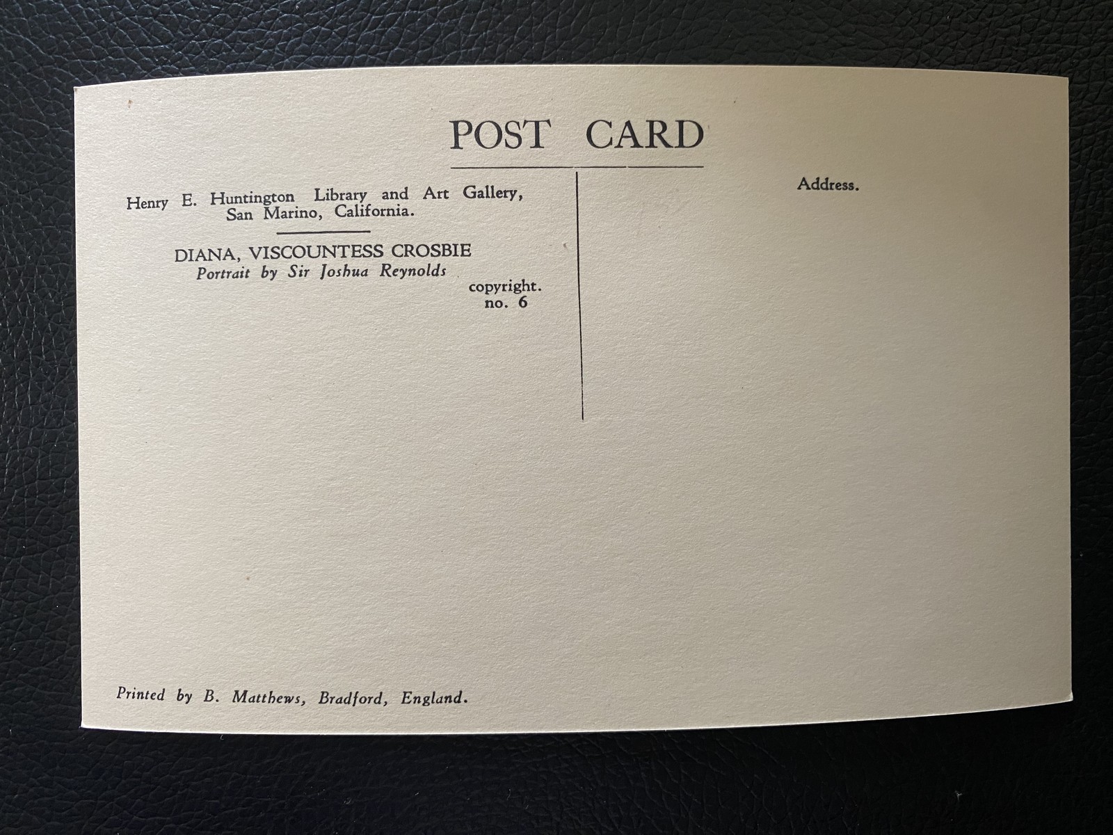 This listing features a Victorian RPPC Postcard with a famous painting of a full-length portrait of Diana Crosbie, Countess Glandore. Diana is seen standing, looking forward and seemingly in mid-movement as if walking through the scene. She is holding onto her dress with her right hand as her left is outstretched to the right. A rolling landscape can be seen to the right, with trees to the left. Diana's hair is up, secured loosely with ribbons and pearls, locks of loose hair falling over her shoulders.