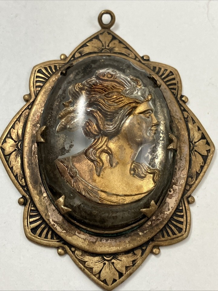 - VICTORIAN GLASS DOME ITAGLIO BRASS CAMEO 2.75”X2” PENDANT