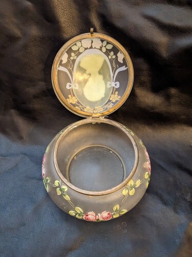 - Victorian Hand Painted Lady Hat Flower Ribbon Satin Glass Powder Jar Hinged Lid