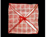 Deep red and ivory silk hankie case ties at the center with silk cord (unfortunately the cord is tangled and disintegrating) the top is made up of 4 triangles of bobbin lace hand work over red silk with red piping accents. The back is red silk and in excellent condition except for ties- in fact it looks to have never been used. This was as found in a Pennsylvania estate.
