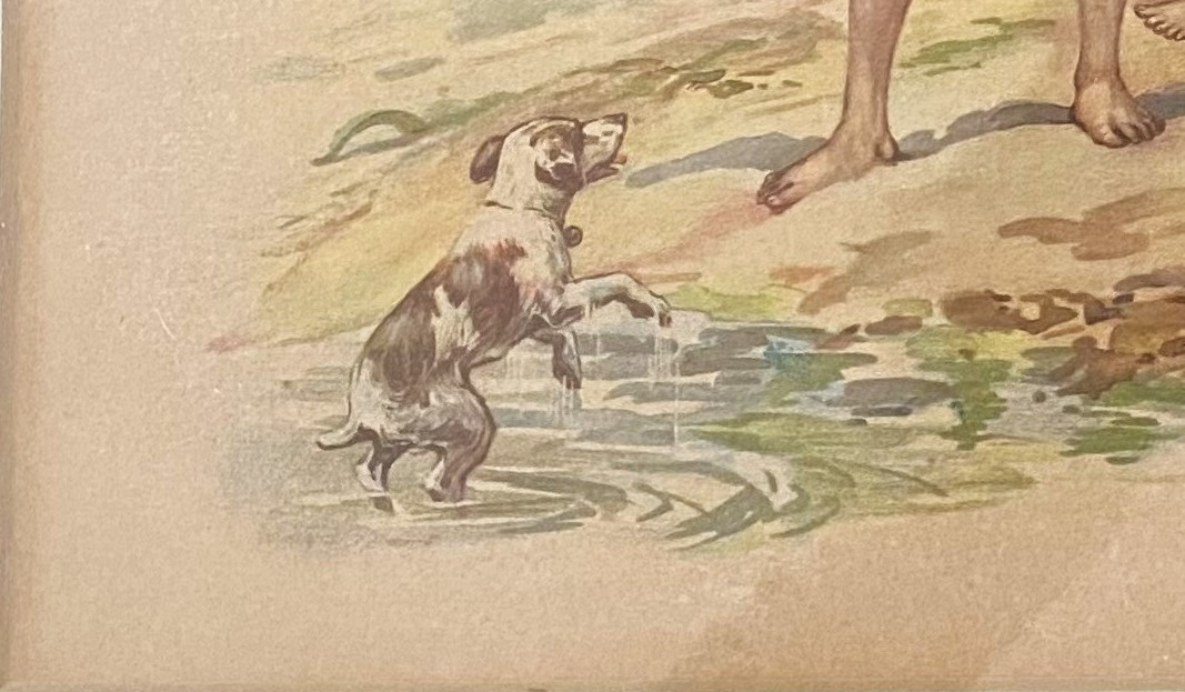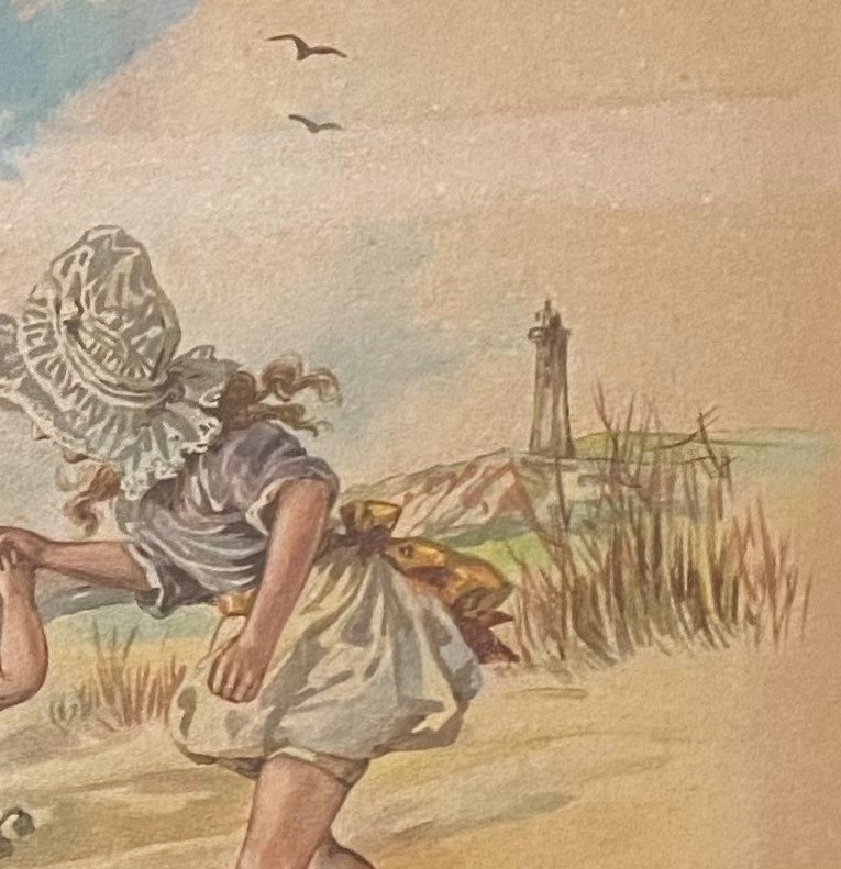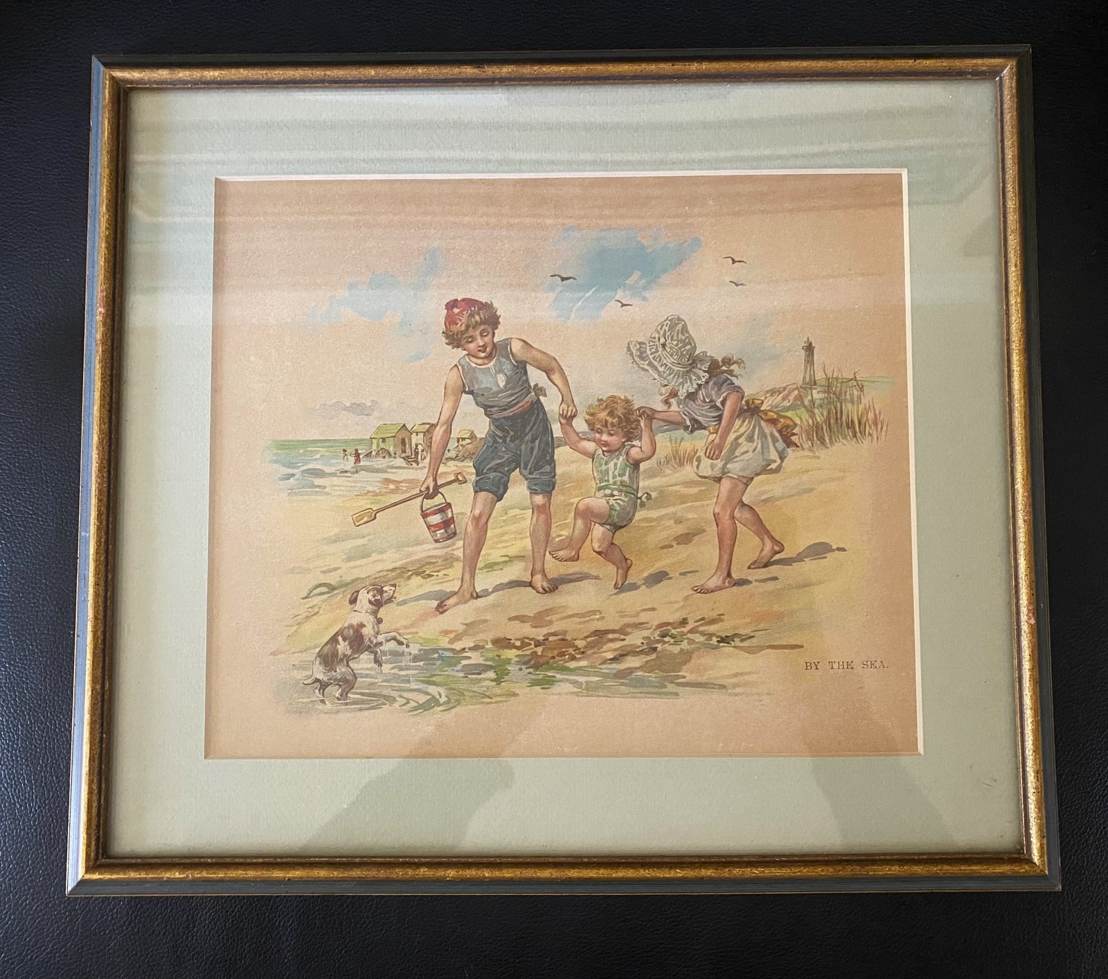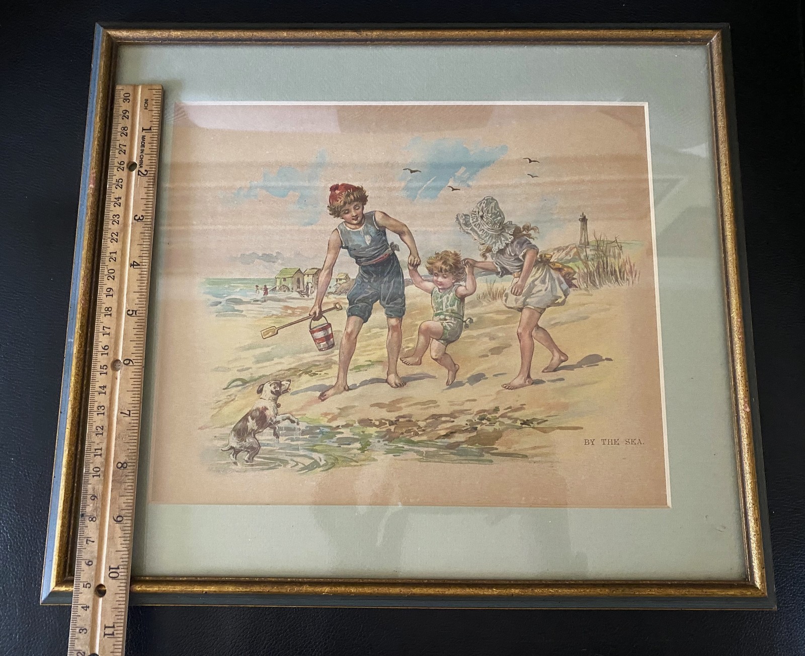 This Victorian Era Lithograph is a delightful and innocent reminder of the joy children can have while playing on the beach. It's titled "By The Sea" and there is no artists name. We spent quite some time attempting to research it to find the artist but we couldn't make any leeway. Nonetheless it's a beautiful picture thats in terrific condition.