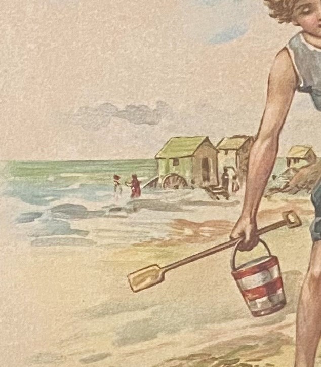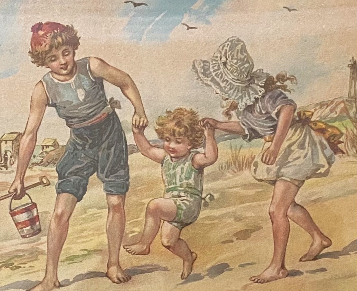 - Victorian Lithograph Titled; By The Sea - Children Playing On The Beach