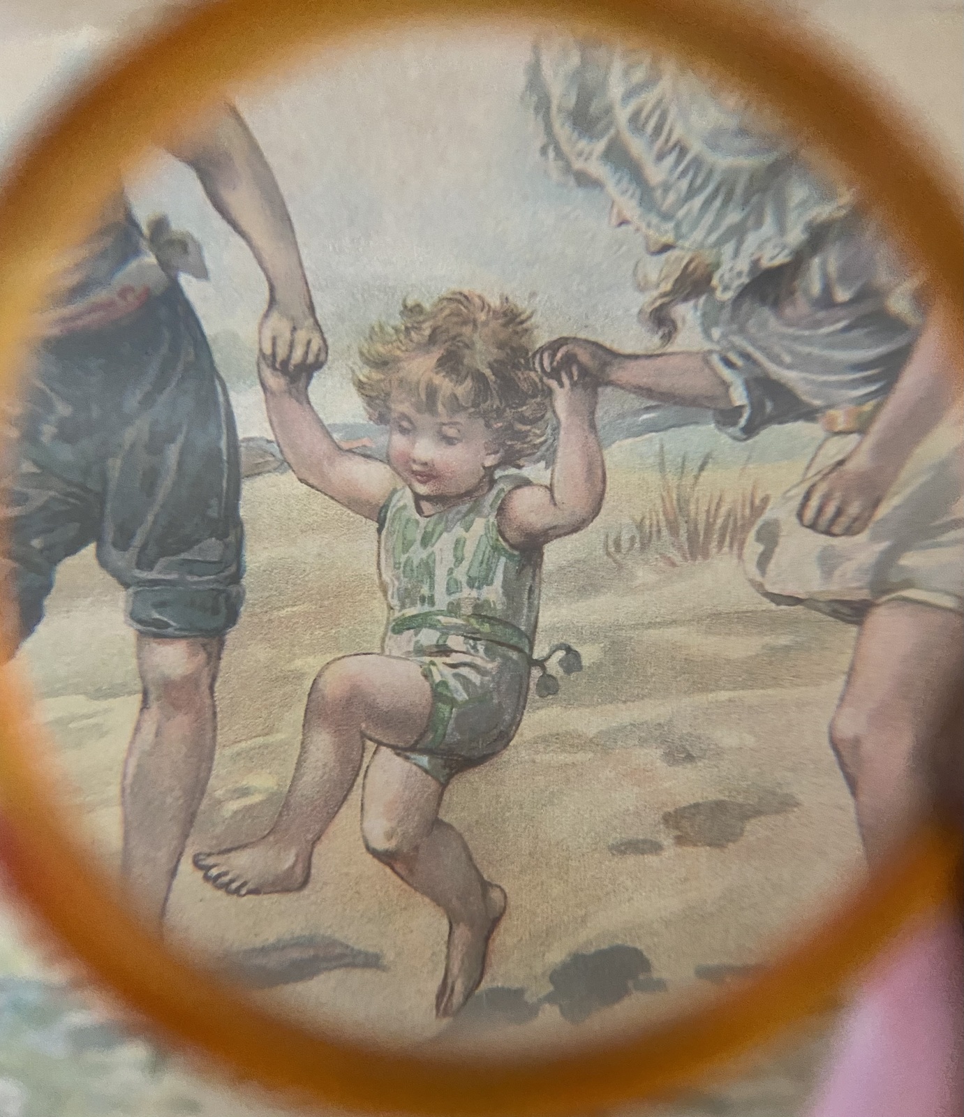 Our last image is of a magnifying loop being held over this picture to show a closeup to prove this picture is a real Victorian lithograph. Boo on dots, this one's no fake... this beautiful picture is the real thing.