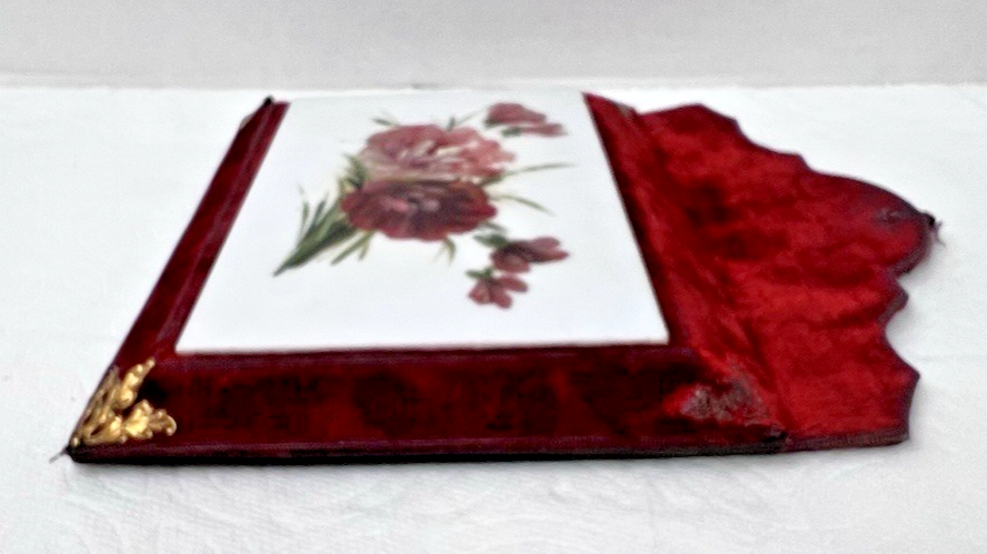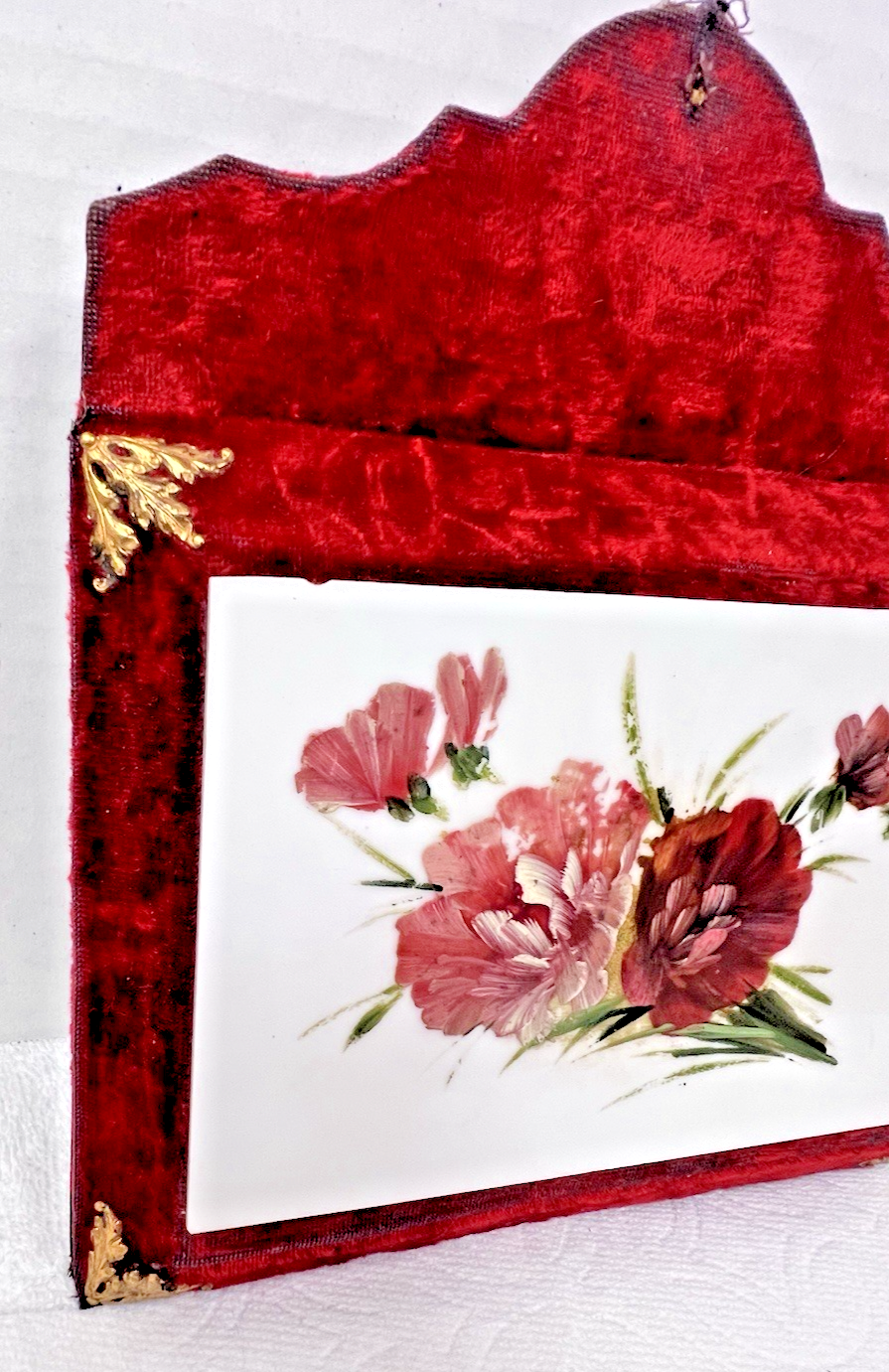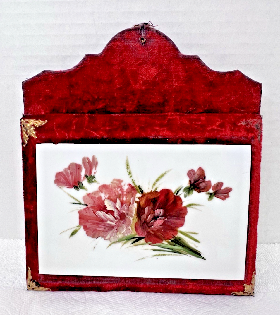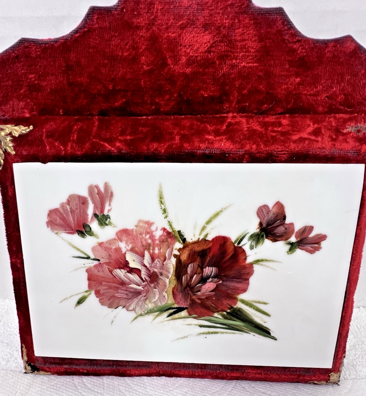 - Victorian Red Velvet w Hand Painted Floral Milk Glass Wall Mail Holder