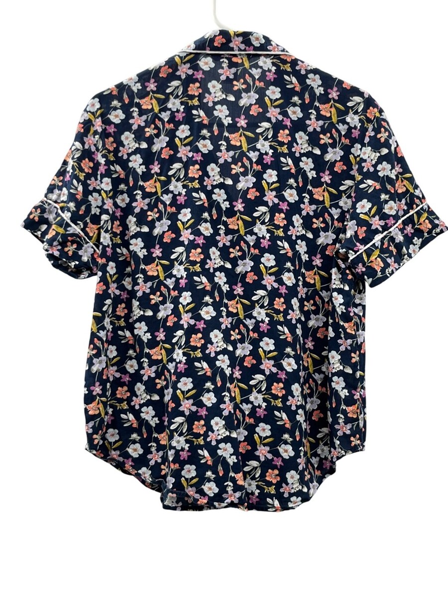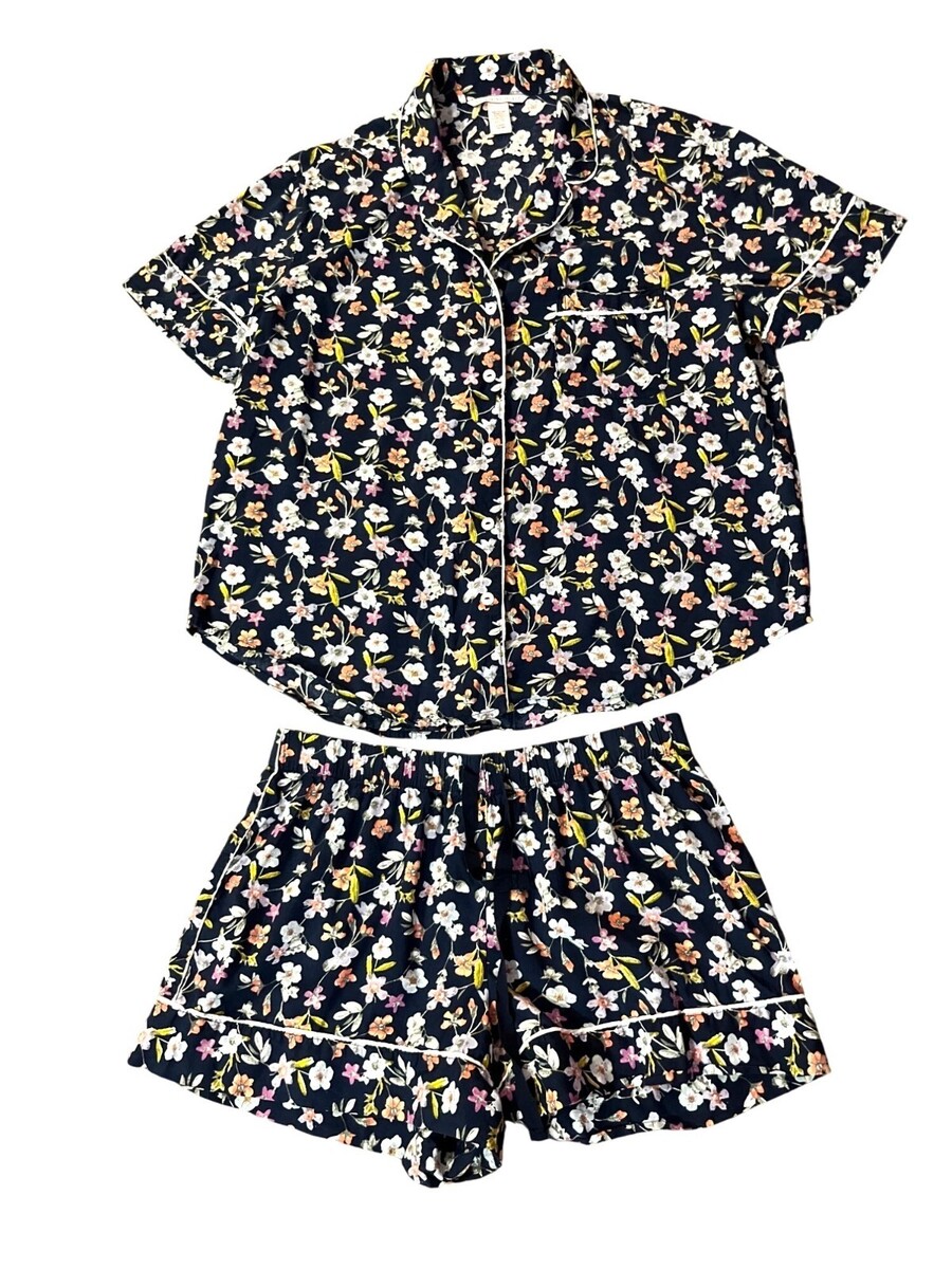 Cozy and feminine Victoria?s Secret two-piece pajama set featuring a short-sleeve button-front top and matching shorts in a navy blue floral print with delicate white piping trim. The lightweight cotton-viscose blend provides breathability and softness for year-round comfort.