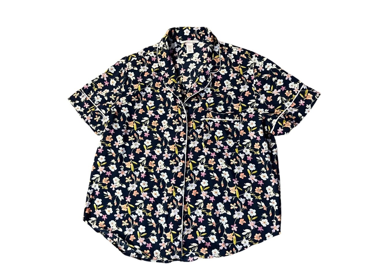 victorias secret pajama set, vs sleepwear, blue floral pajamas, button front short sleeve, drawstring shorts, womens small pajamas, cotton viscose set, victoria secret lounge set, two piece pj set, navy floral pajamas, comfy sleep set, Spring, Summer, feminine, pretty