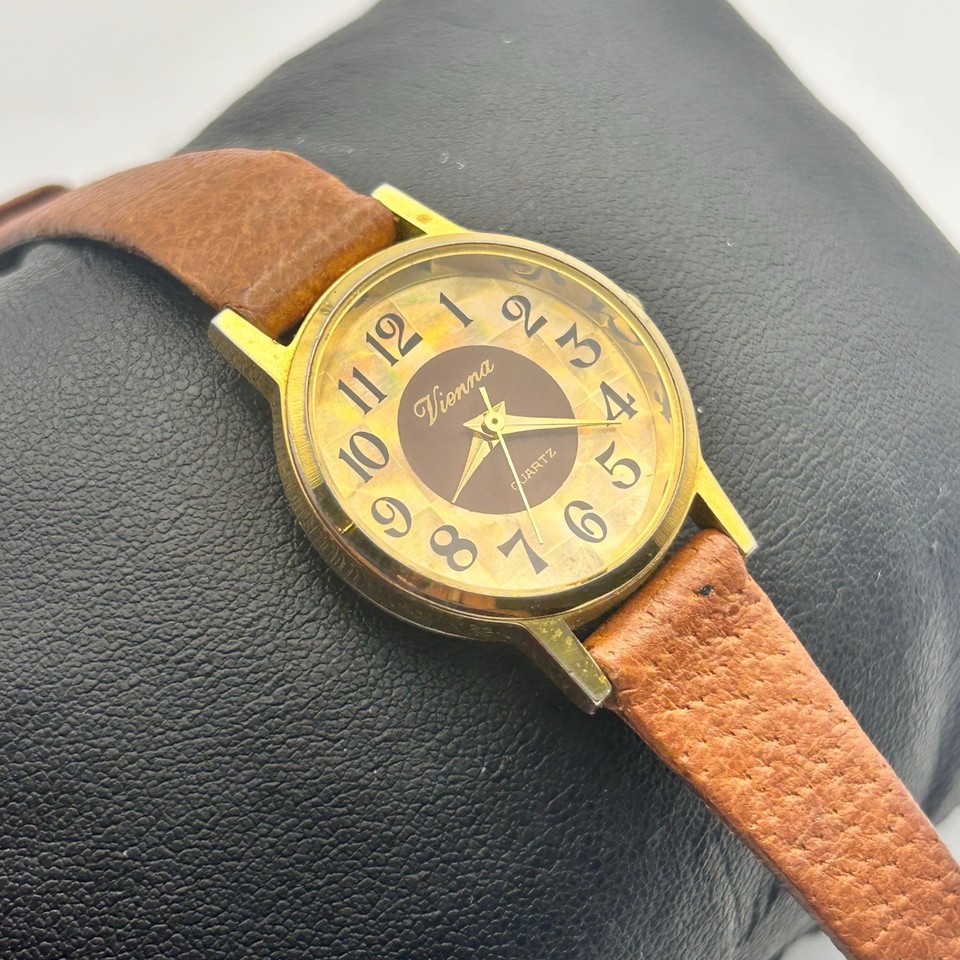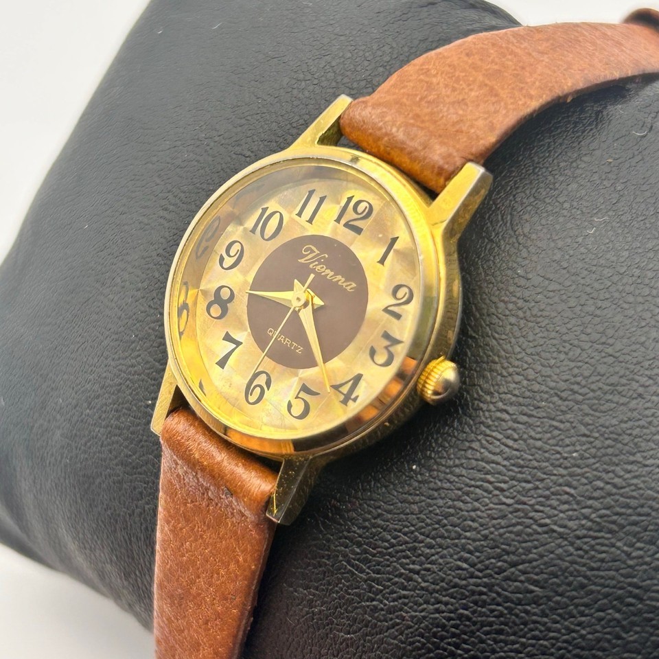 This is a beautiful Vienna women's quartz watch, featuring a lovely gold-tone finish and a stylish brown leather band.