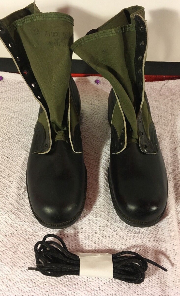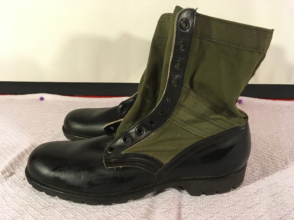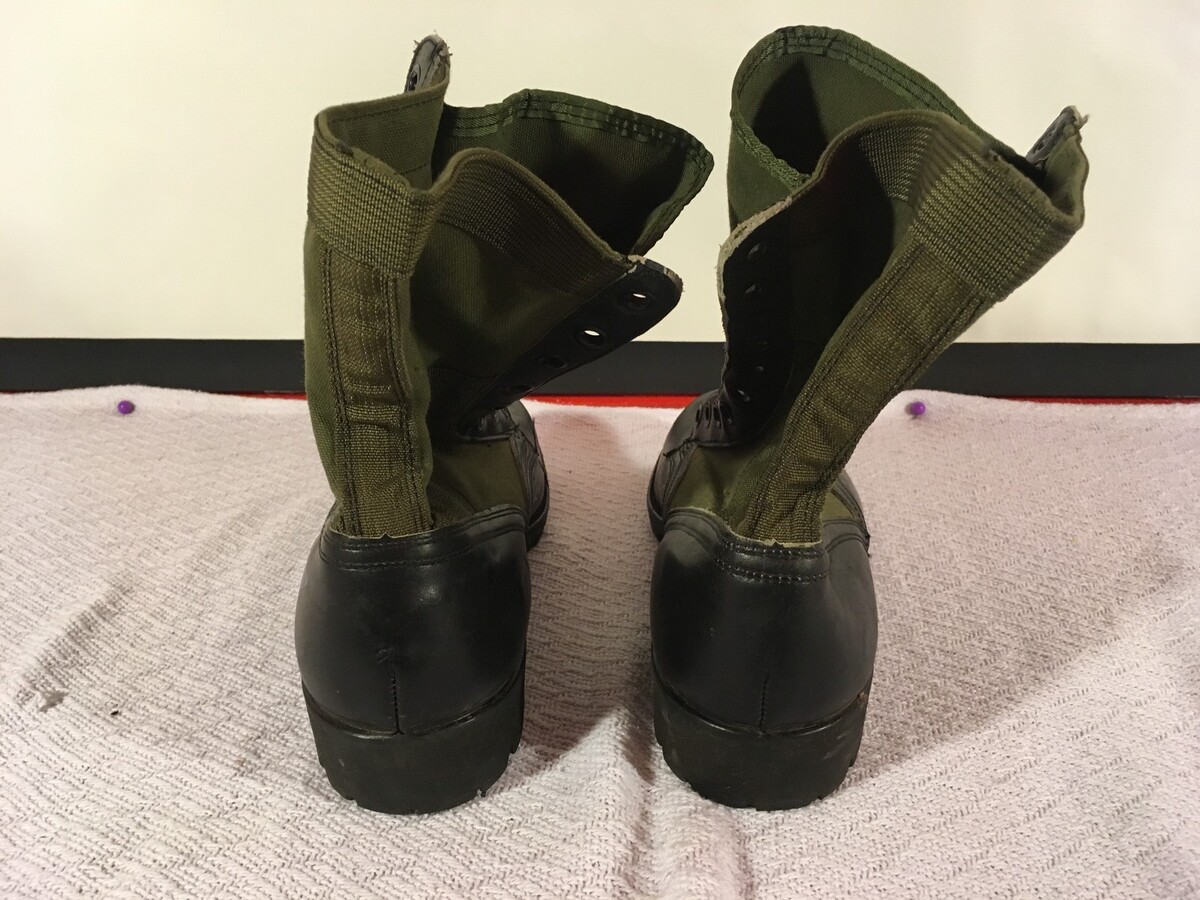 THERE IS SOME SCUFFING HERE AND THERE, PLEASE KNOW THAT THESE ARE THE ORIGINAL GREEN JUNGLE BOOTS USED DURING THE VIETNAM CONFLICT, OPERATION JUST CAUSE IN PANAMA, OPERATION URGENT FURY IN GRENADA, THEY HAVE BEEN IN A DUFFEL BAG OR IN A BOX IN A CLIMATE CONTROLLED STORAGE UNIT FOR OVER 55 YEARS, THEY ARE NOT IN PERFECT CONDITION, THEY ARE NEW OLD STOCK. AS A FELLOW VETERAN YOU KNOW THE BEST WAY TO MAKE SCUFFS GO AWAY AND THATS WITH GOOD OLD BLACK SHOE POLISH AND HOT WATER , THE SOLES ARE 100 PERCENT AND READY FOR A 20K MARCH. AGAIN THESE ARE NEW AND THE ORIGINAL 1963- 1968 ISSUED GREEN HOT WEATHER JUNGLE BOOT. PLEASE TAKE A LOOK AT MY PICTURES AND KNOW YOU ARE GETTING THE REAL DEAL.