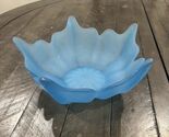 This is a vintage Viking candy dish made of frosted satin glass with a cobalt blue color. The dish is shaped like a lotus flower and measures 10 inches in diameter. It is an elegant glass production style and perfect for decorative use.