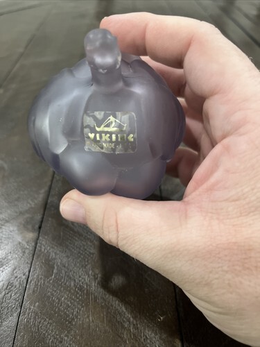 This beautiful Viking Glass paperweight features a grape bunch design in Lilac Frost Teaberry color. It is a unique piece of art glass that will make a great addition to your collection. The paperweight was produced in the late 20th century (1980-1989) and has a sticker on it.