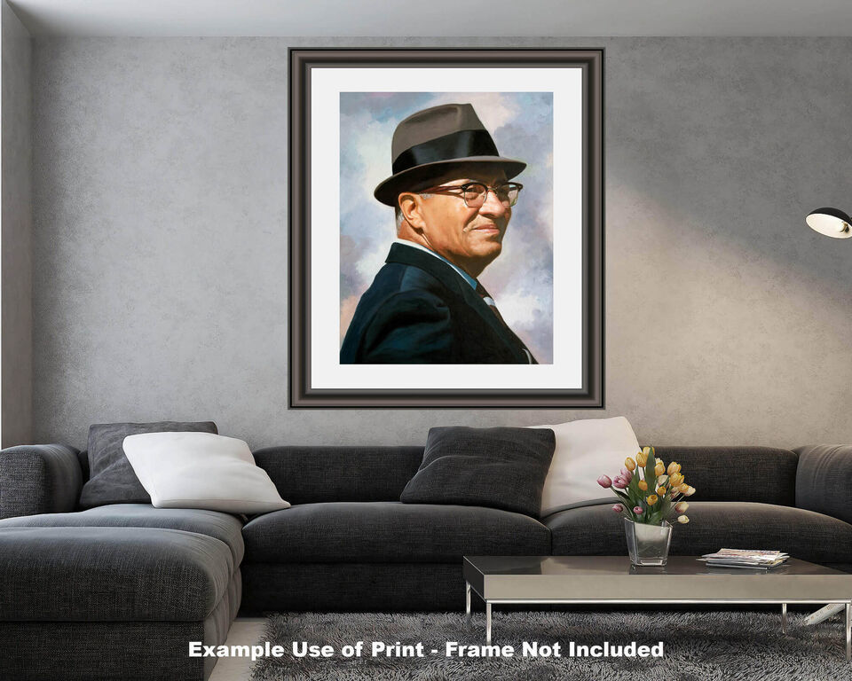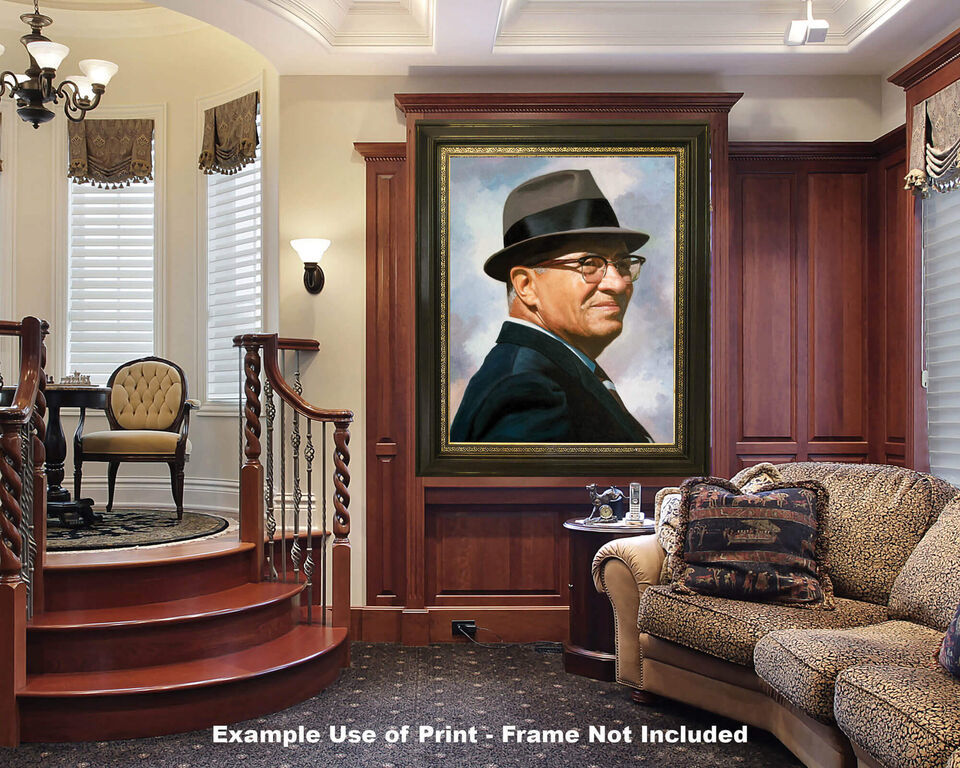 This fine art print from oil painting by Arthur Milligan features HOF Hall of Fame Head Coach Vince Lombardi Green Bay Packers NFL Football Team Giclee Print. This exclusive Vince Lombardi Green Bay Packers NFL Football Player title is a 11x14in Matte Paper Print, 28x36cm. The 192gm 10.3mil enhanced paper. It appears flat matte with no sheen (NOT shiny.) The print will appear as glossy as the glass when framed (mat, picture frame or glass NOT included.) SEE OPTIONS for Size Stye (8x10-40x50in) in choice of a fine art print on Matte Paper, gallery wrap canvas stretched over 3/4 inch thick wood frame, or high quality print on matte polyester or matte cotton canvas rolled and shipped in a tube. Viewing screens have different color calibration (light, dark, green cast, blue cast etc...) so the print color may vary. The print colors are calibrated to match the original art or photo.