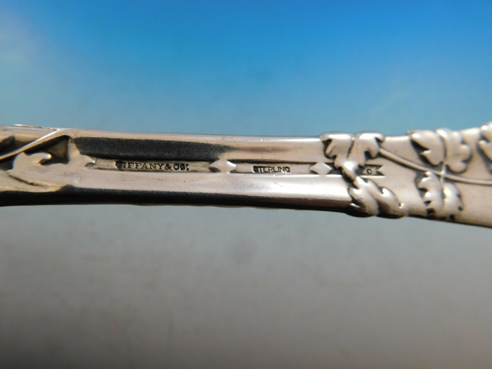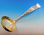 Beautiful sterling silver Soup Ladle measuring 11" in the pattern Vine by Tiffany and Co. Vine is a multi-motif pattern circa 1872 and has become very scarce on the market. This server features a tomato motif on the handle that leads to the beautifully gold-washed swirl style serving bowl. It is monogrammed (see photo) and is in excellent condition.