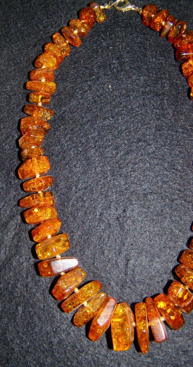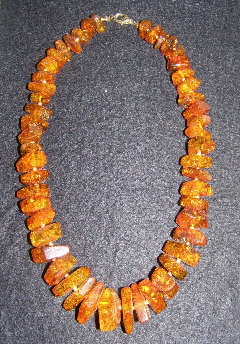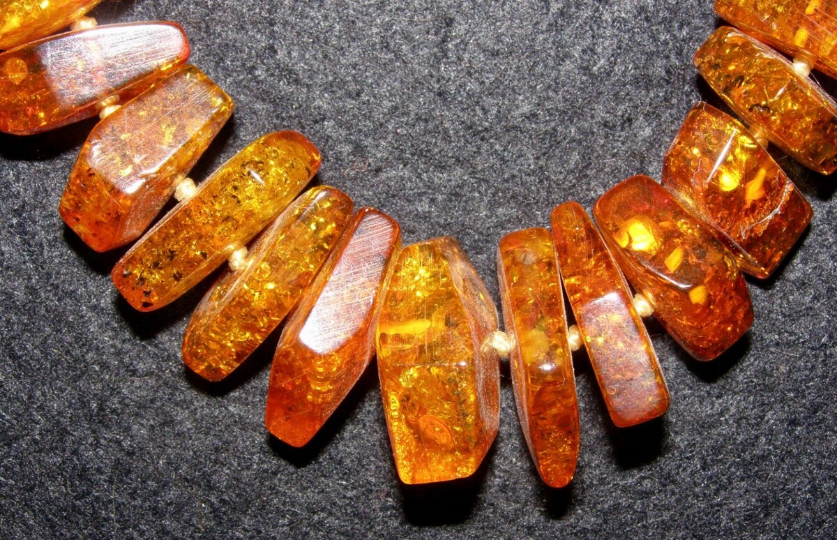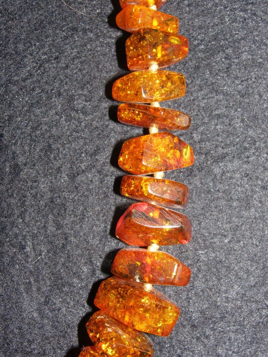 - VINT. BALTIC AMBER FACETTED HAND KNOTTED FLAT SHAPED BEADS w/ INCLUSIONS, COGNAC