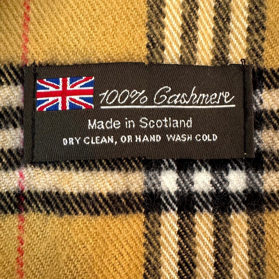Vintage 100% cashmere scarf woven in Scotland, showcasing a rich mustard-camel tartan with black, white, and red overcheck. The Union Jack "100% Cashmere ? Made in Scotland" tag dates it to the late 1980s?1990s, when Scottish mills in Hawick and Elgin produced dense, two-ply cashmere for export. Soft brushed nap?silky one way, airy the other?with full twisted fringe at both ends.