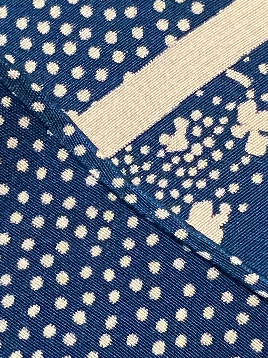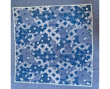 The photos make this look less than crisp blue and white, but it is actually flawless. Singed Bouchara, 34" square. It has clovers, ribbons and strings of pearls in the print. It has a beautiful drape as well.