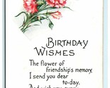 This charming vintage birthday postcard features a delicate bouquet of pink carnations, symbolizing friendship and affection, beautifully illustrated in a classic lithographic style. The card's sentiment reads, "Birthday Wishes - The flower of friendship's memory, I send you dear to-day, And wish you every happiness On this your Natal Day," capturing the timeless warmth of early 20th-century greetings. The lithograph printing technique with chrome features adds a subtle shine and depth to the floral artwork, enhancing its visual appeal.