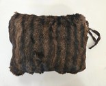 Fur in a slightly striped pattern on the front and brown fabric backing. Slits on either side to put your hands inside the hand warmer. Wrist strap for easy transport.