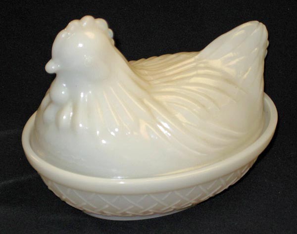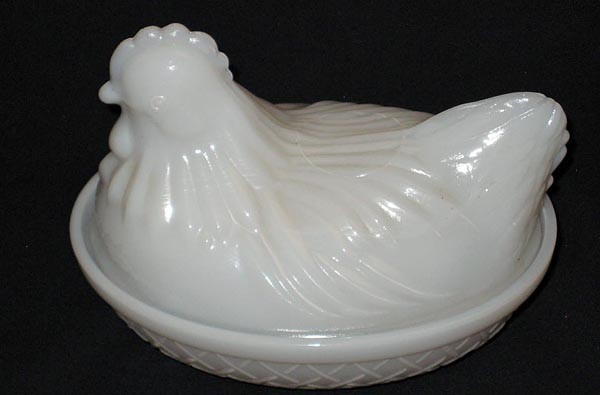 - Vintage 1940s Hazel Atlas Hen On Nest Opalescent Milk Glass Blue Tint Dish w Lid