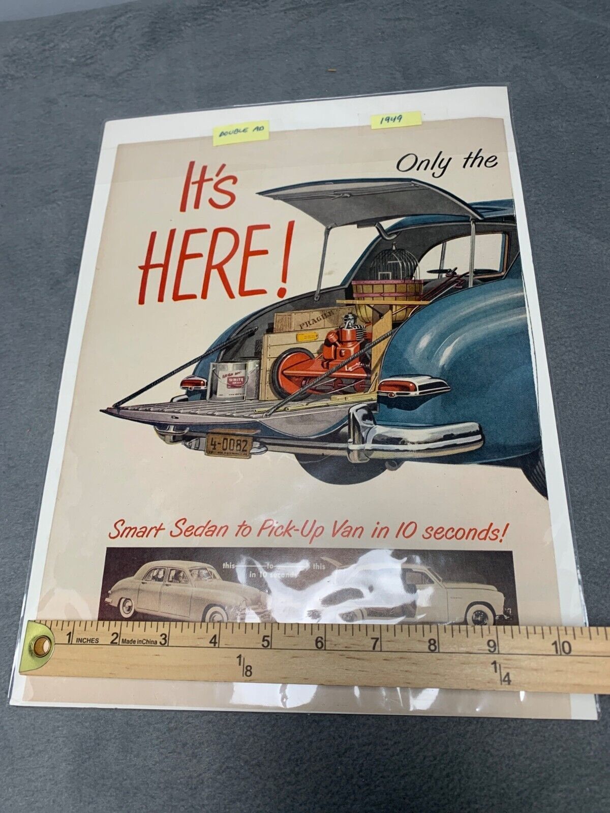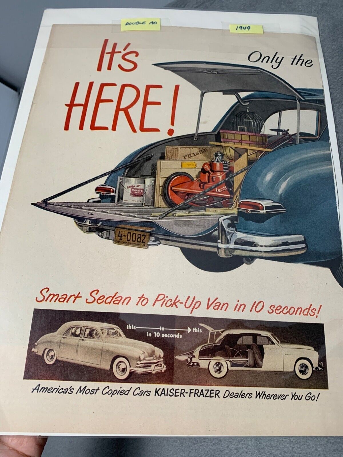 A glimpse into the past with this 1949 Kaiser Traveler double ad, a nostalgic piece from the golden age of automobiles. The ad boasts a smart sedan that transforms into a pick-up van, showcasing the practicality and innovation of the era. A collector's treasure that captures the spirit of post-war America.