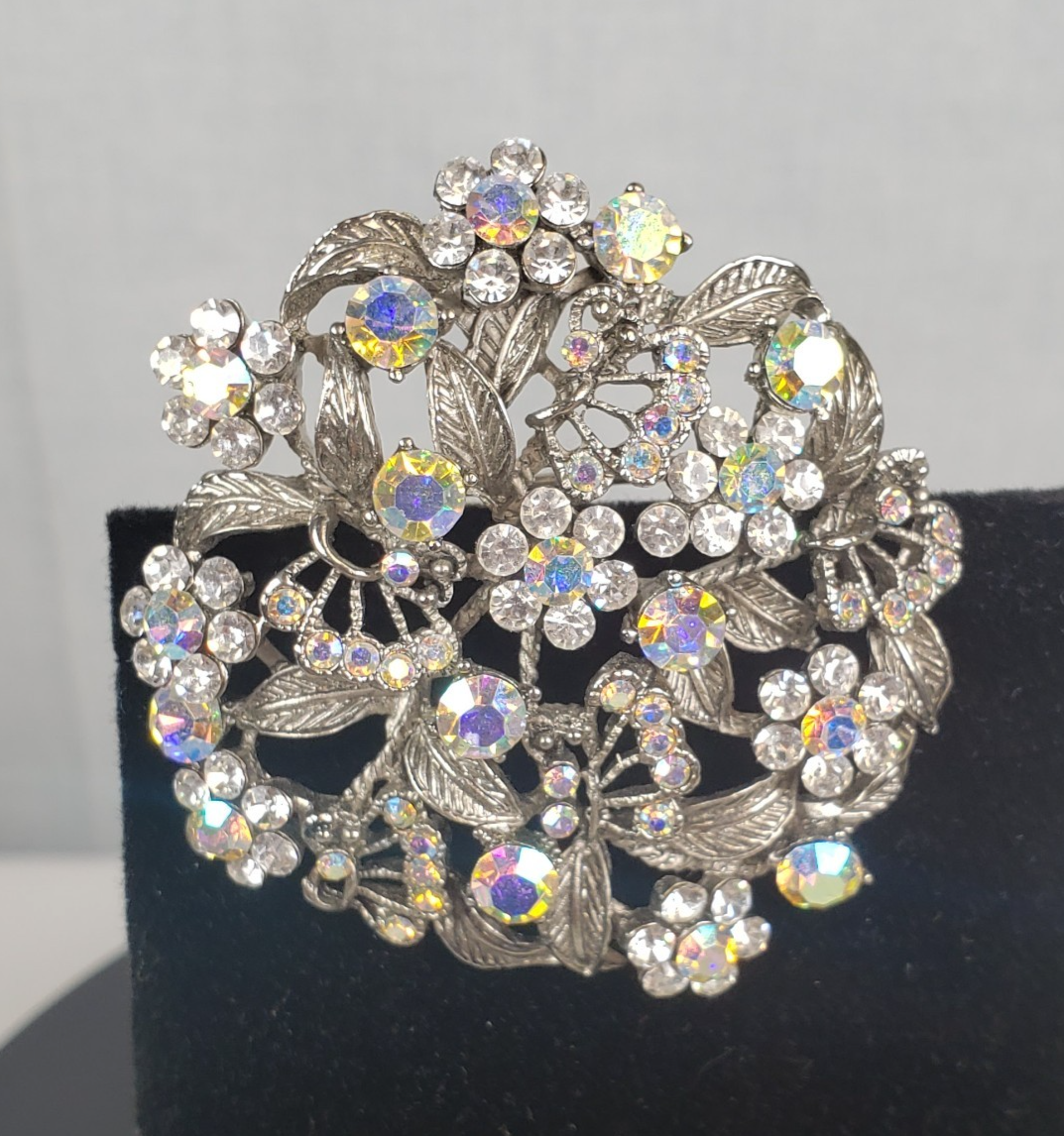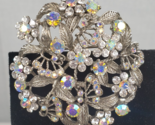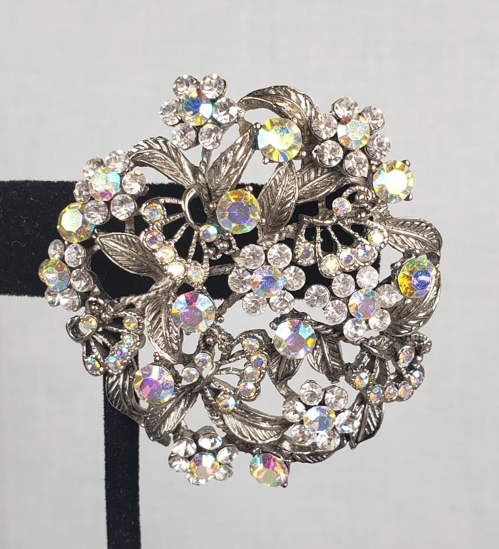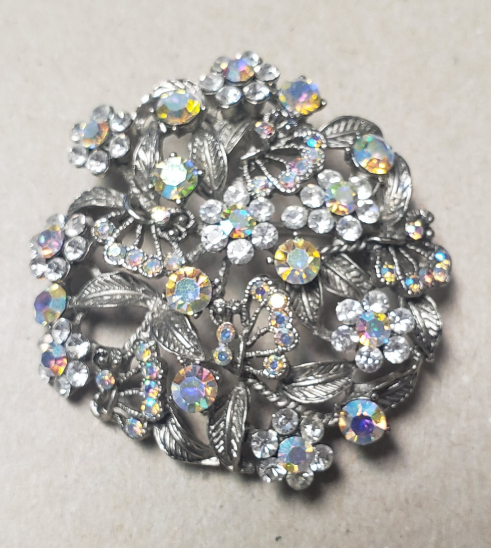 - Vintage 1950's Flower Filigree AB Crystal Rhinestone Silver Tone 2" Brooch