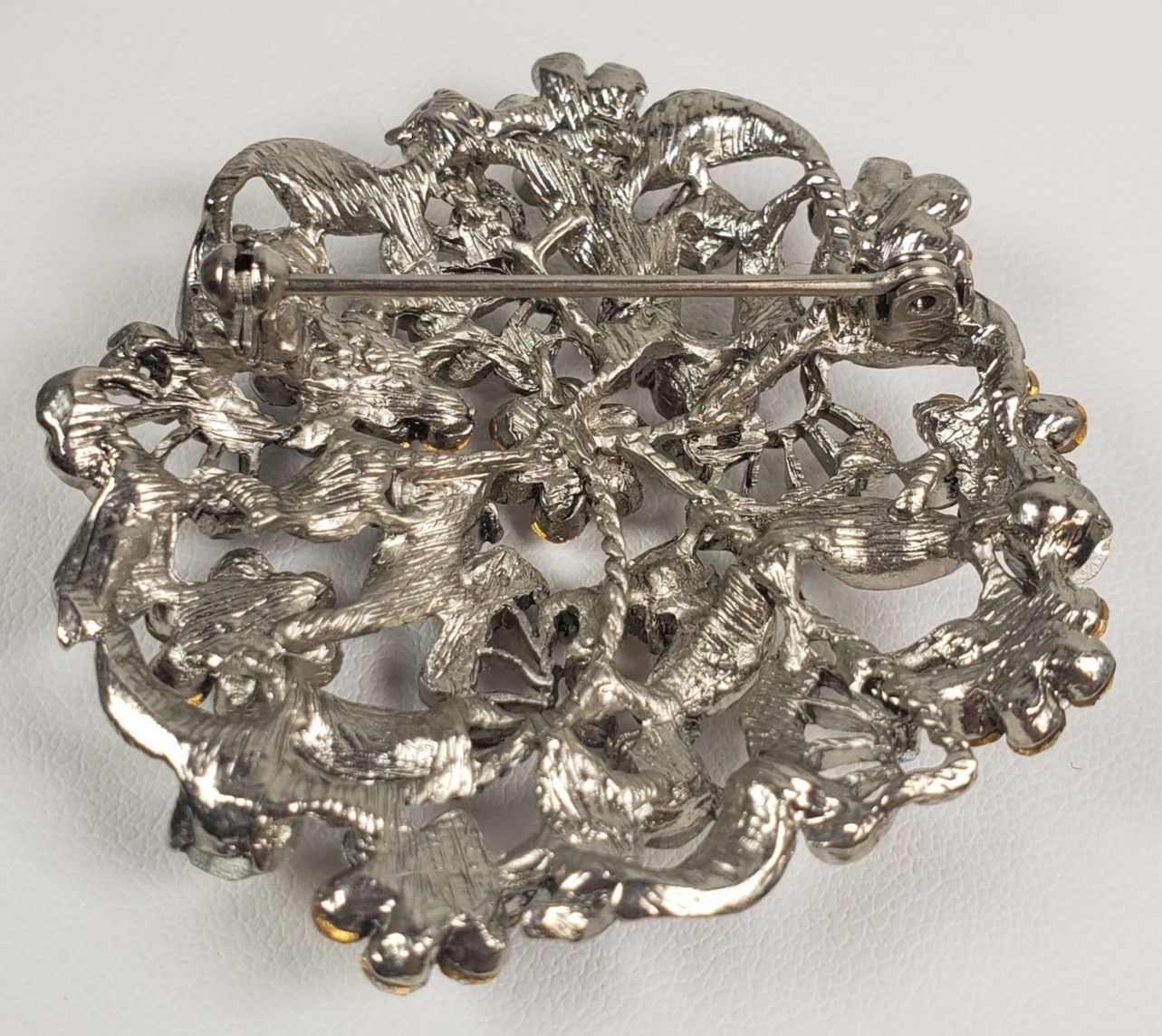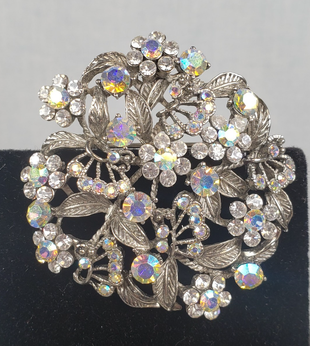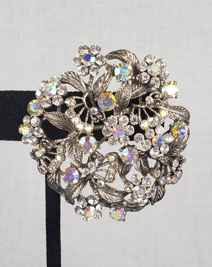 - Vintage 1950's Flower Filigree AB Crystal Rhinestone Silver Tone 2" Brooch