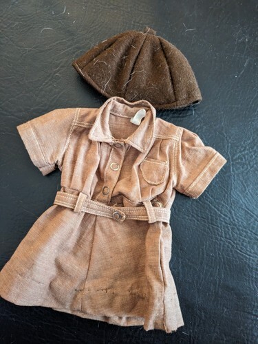 Habillez votre poupee Terri Lee vintage des annees 1950 de 16 pouces dans cette adorable tenue Girl Scout Brownie ! Cet ensemble comprend une robe marron et un chapeau assorti. Le tissu et les details complexes font de cette tenue une piece pour une occasion speciale pour votre poupee de jeu Terri Lee. Cet ensemble de vetements original est un incontournable pour tout collectionneur ou amateur de poupees. La couleur marron et le design intemporel en font un complement parfait a toute garde-robe de poupee. Apportez un morceau d'histoire a votre collection avec cette authentique tenue Terri Lee Girl Scout Brownie.