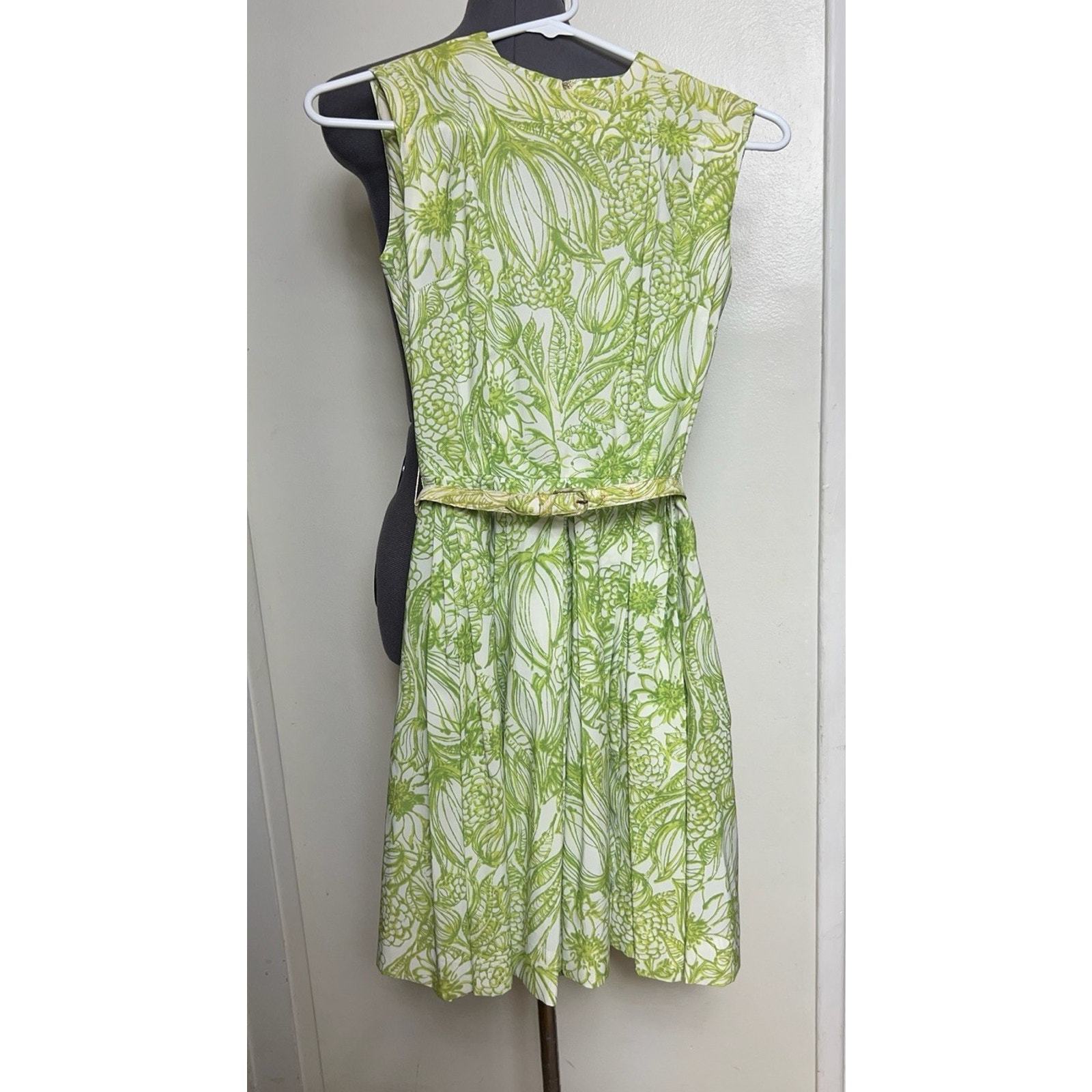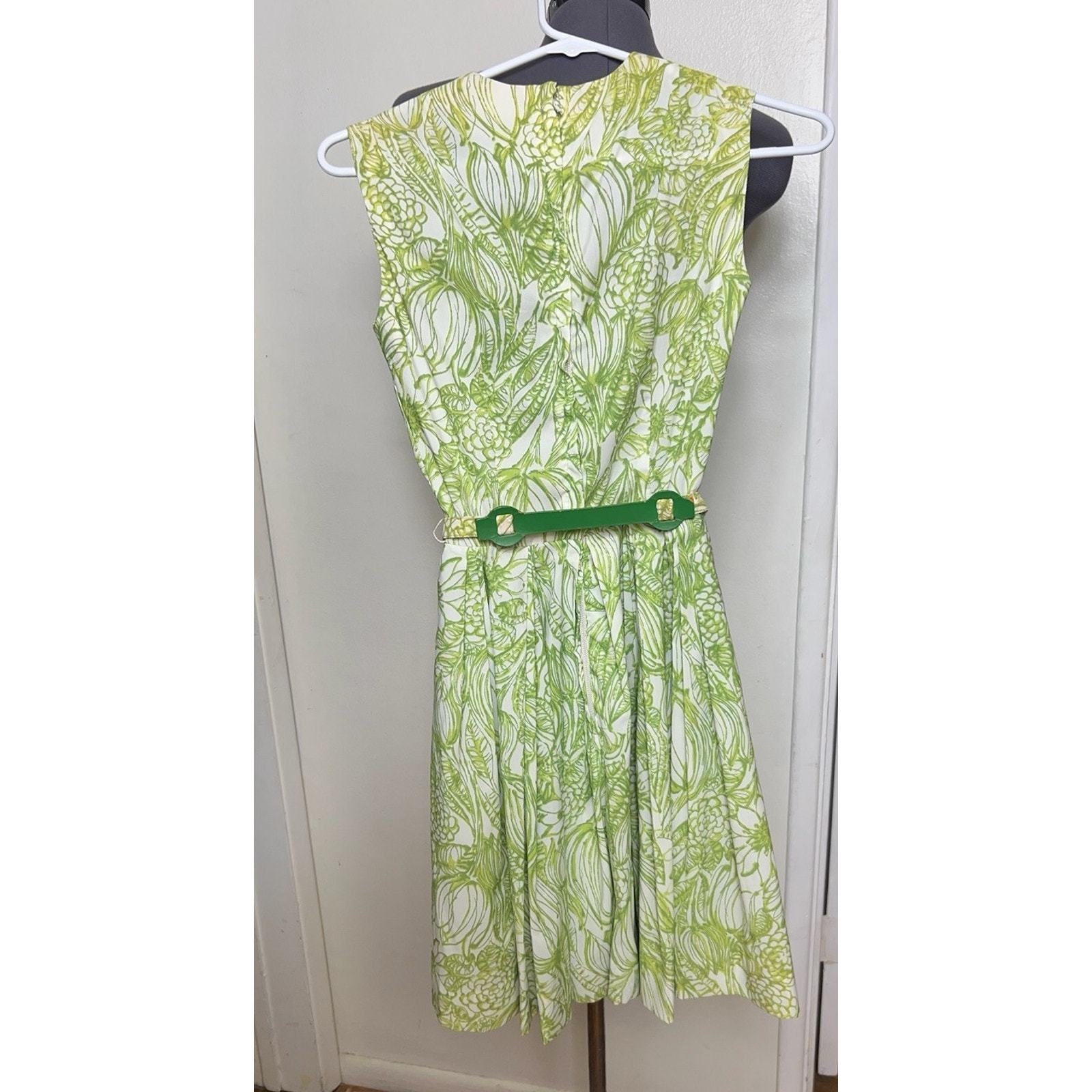 Vintage 1950s House of Nine Green White Floral Foliage Sleeveless Dress Belt XS