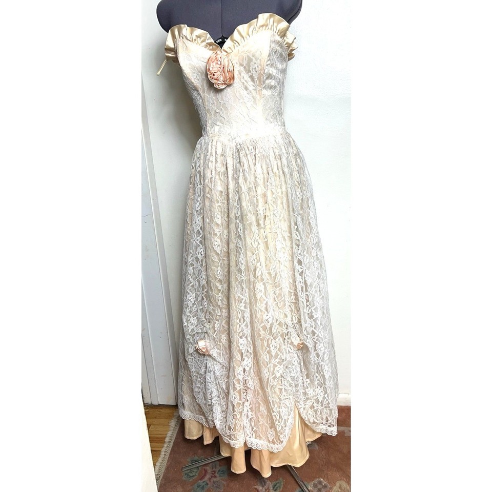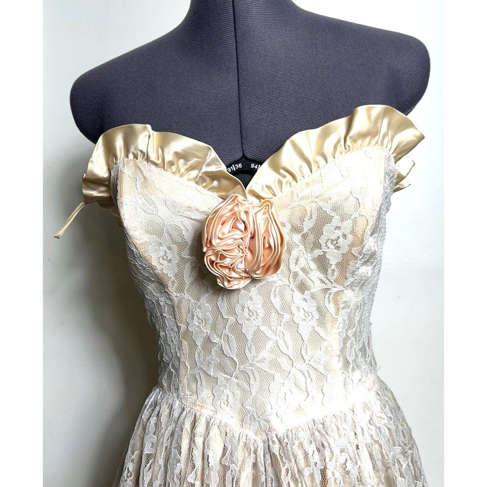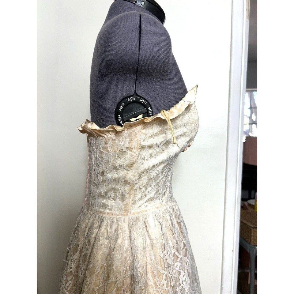 - Vintage 1950s Strapless Party Dress Peach Satin Lace Bridal Prom Gown Petticoat
