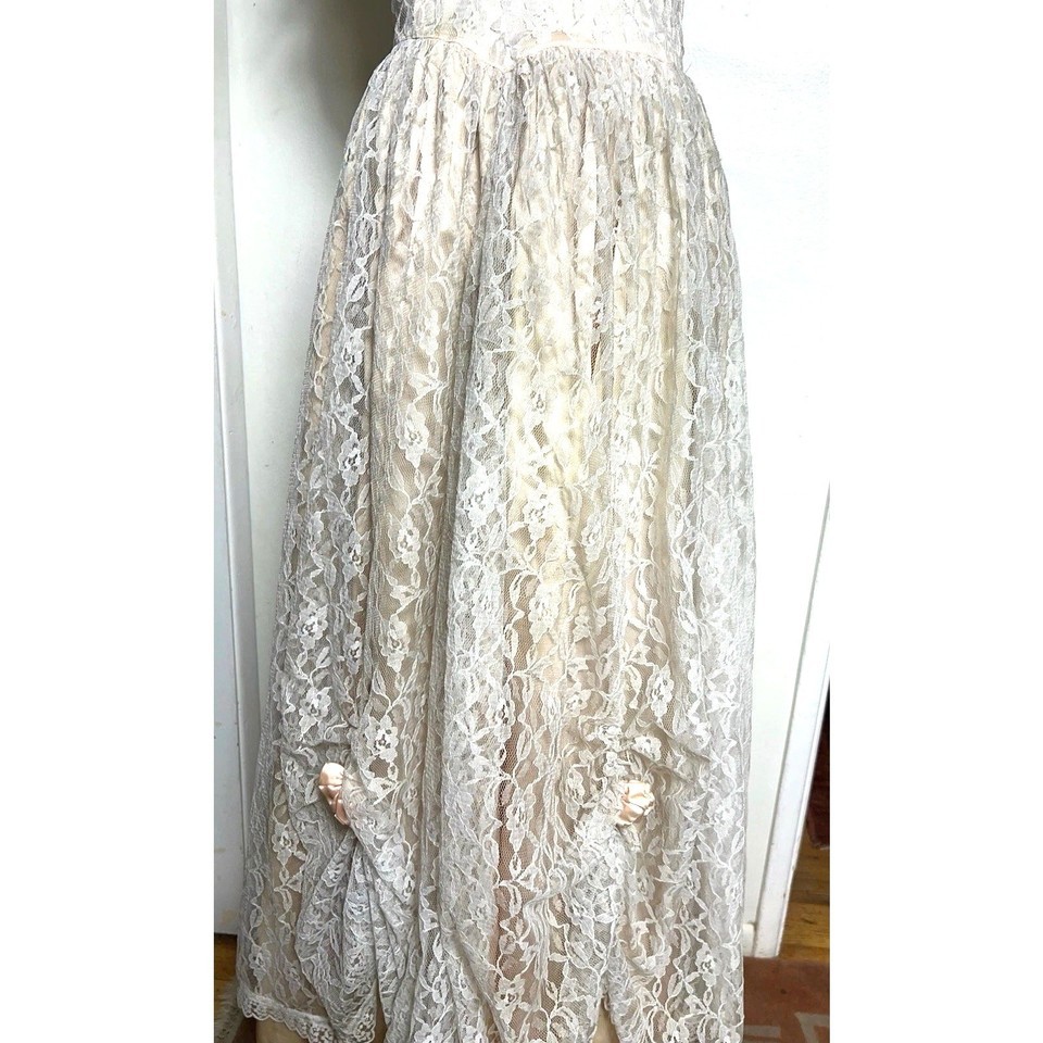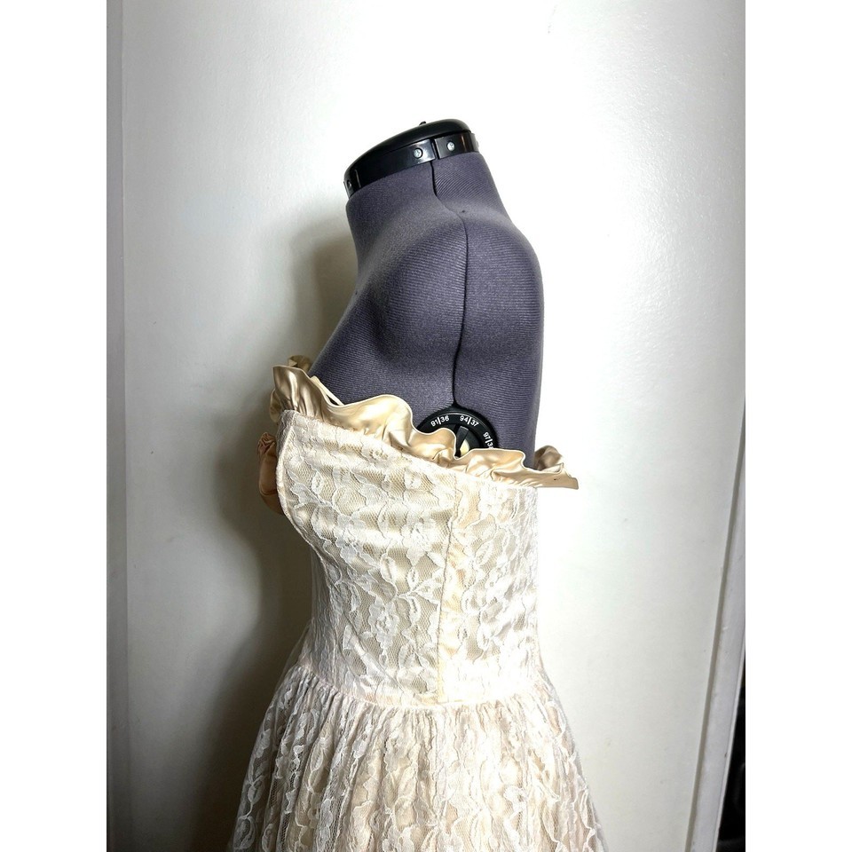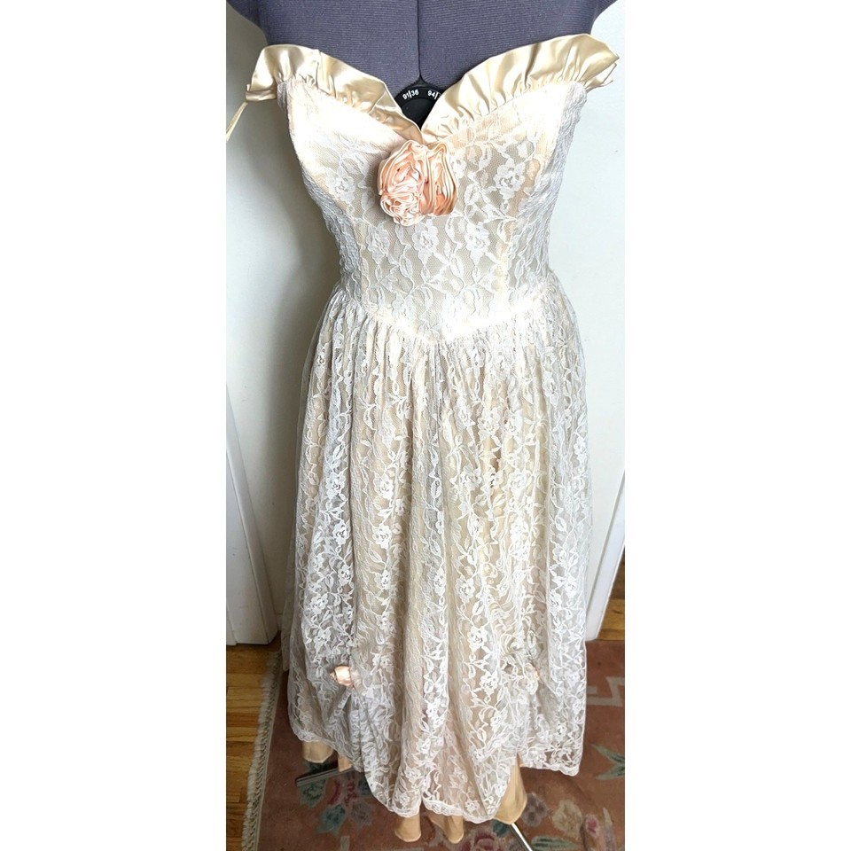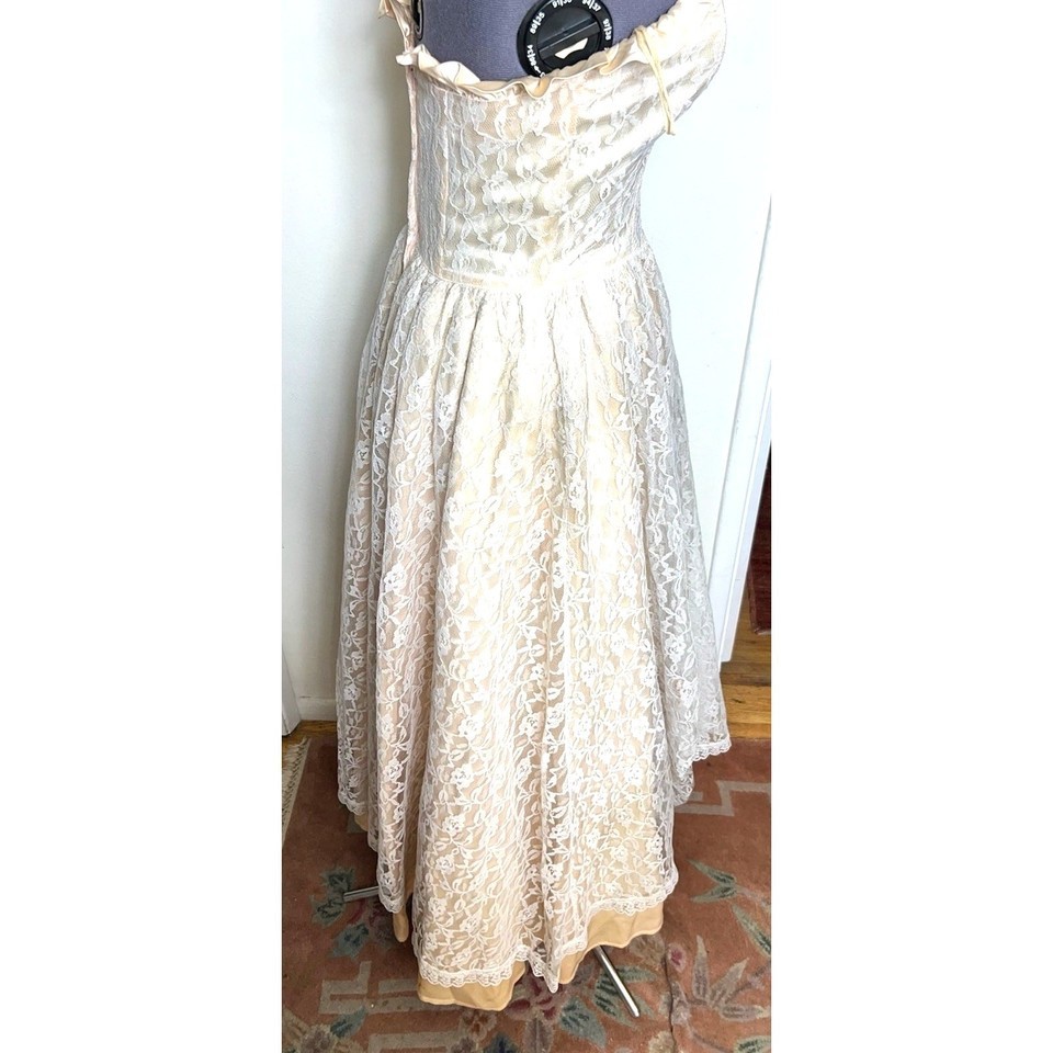 - Vintage 1950s Strapless Party Dress Peach Satin Lace Bridal Prom Gown Petticoat