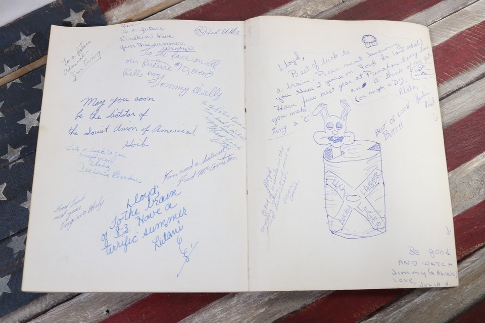 The product appears to be a vintage 1957 yearbook from Na Opio O Punahou school in Hawaii, Honolulu. It is signed by the students and teachers, making it a unique and collectible item for those interested in historical memorabilia from schools in the region. This yearbook offers a glimpse into the education system and culture of the time, serving as a valuable artifact for collectors of vintage school memorabilia.