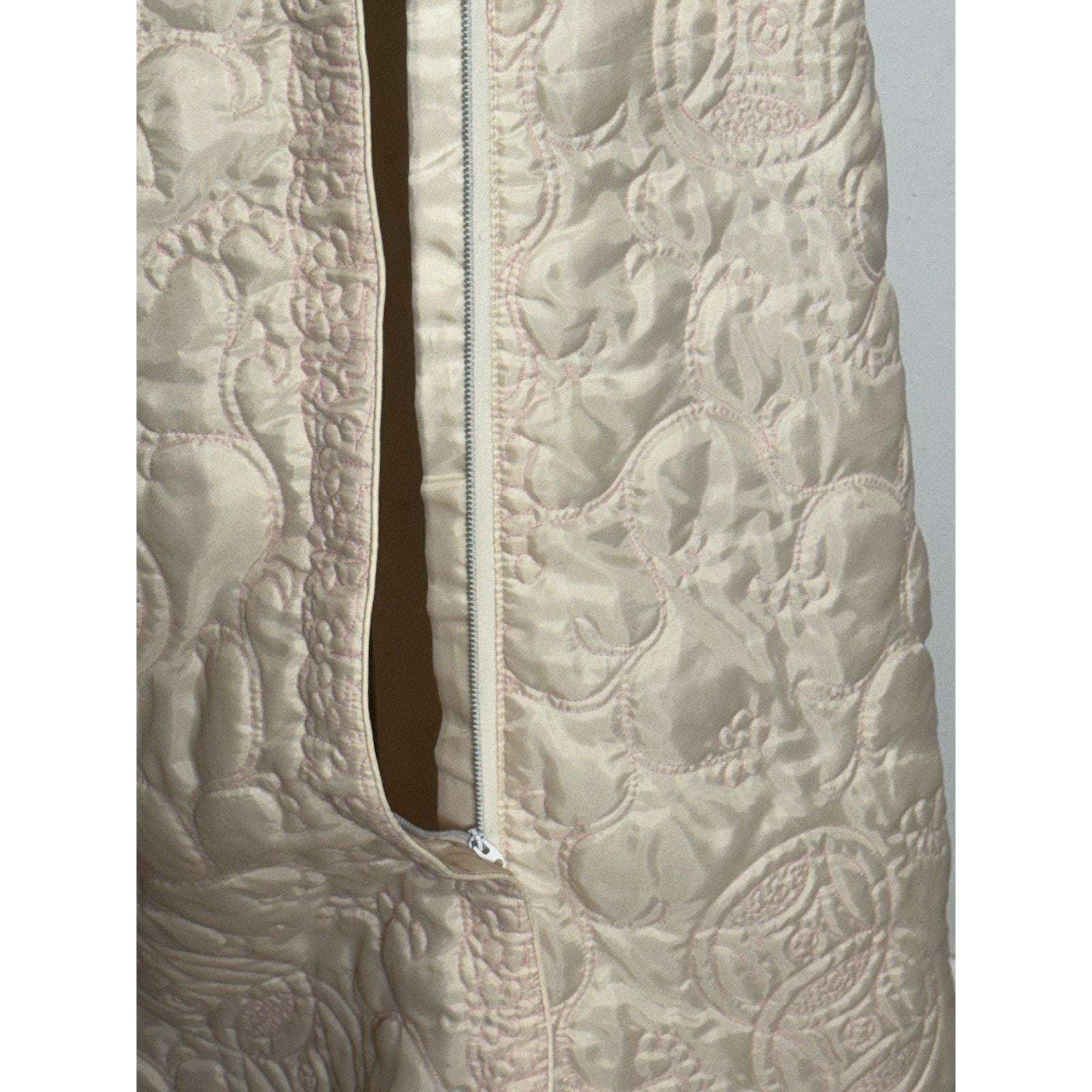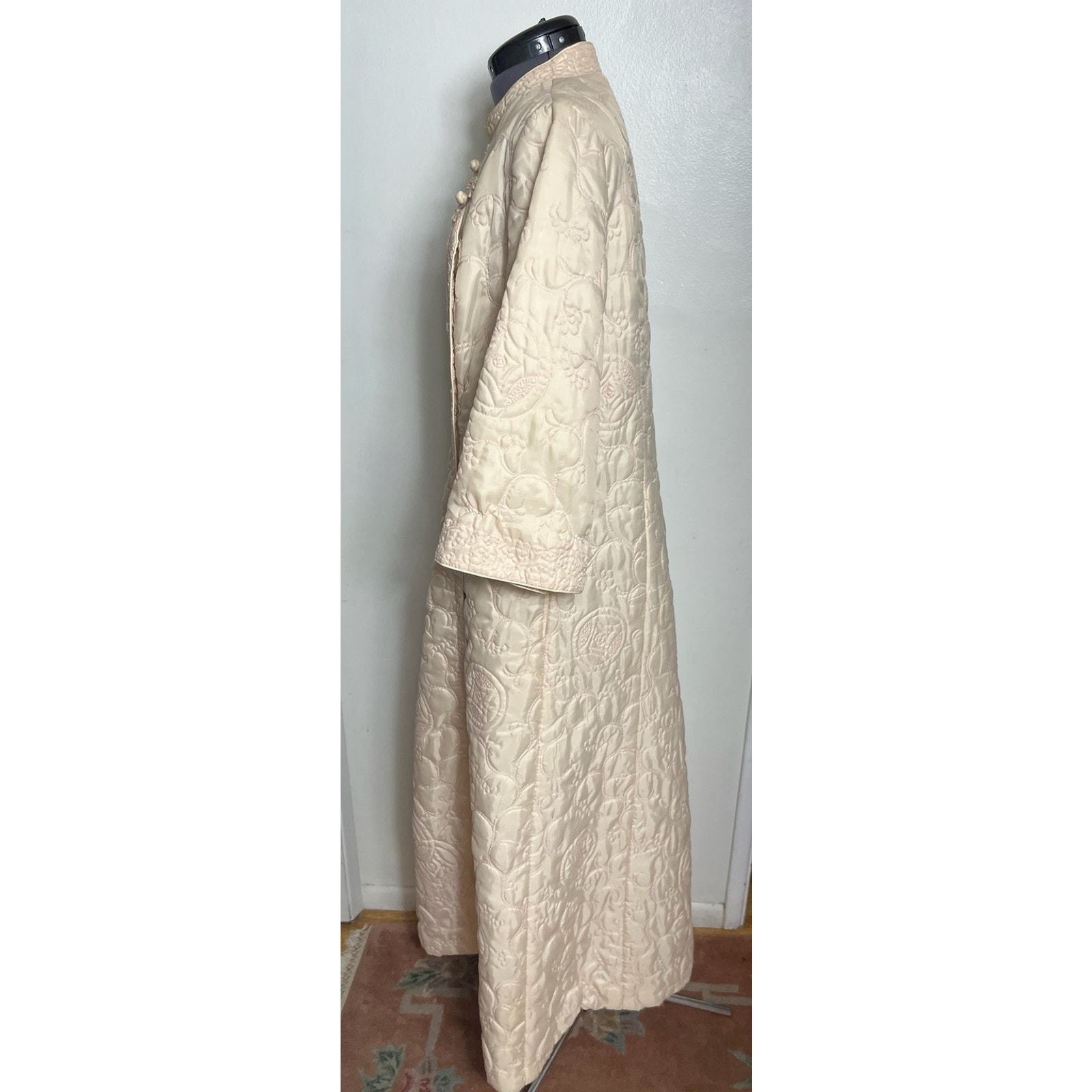 This vintage quilted robe was made exclusively for Robinson?s Department Store in the British Colony of Hong Kong during the 1960s. Features include a long lined design, ornate Chinese button closures, and a pink quilted pattern with traditional embroidery details. Crafted from 100% polyester, this mid-century robe blends elegant Asian-inspired style with timeless vintage charm. Zipper goes 3/4 down. You step into the robe.