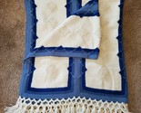Vintage 1968 Hand Crochet Afghan Blanket Blue Beige w/ Tassels 54x66 Inch