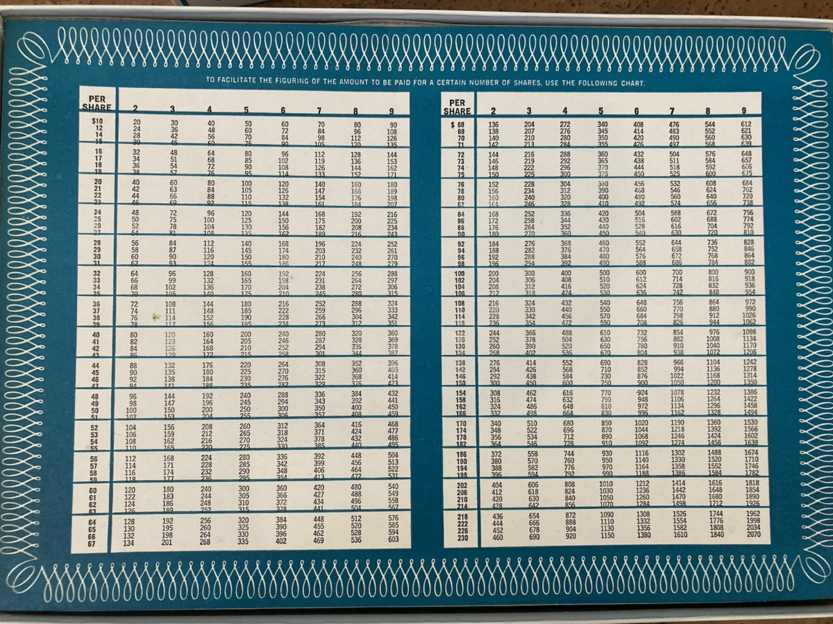 Contents. 8 players, 8 different stocks x 8 cards. share notes 1 x 36, 5 x 16, 10 x 16, 20 x 12, 50 x 12, 100 x 12, 500 x 8, 1000 x 8.
