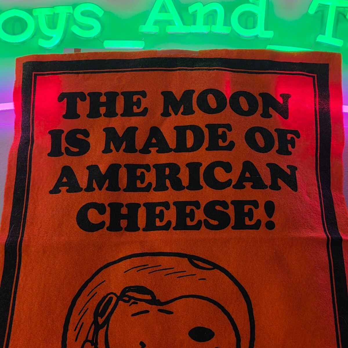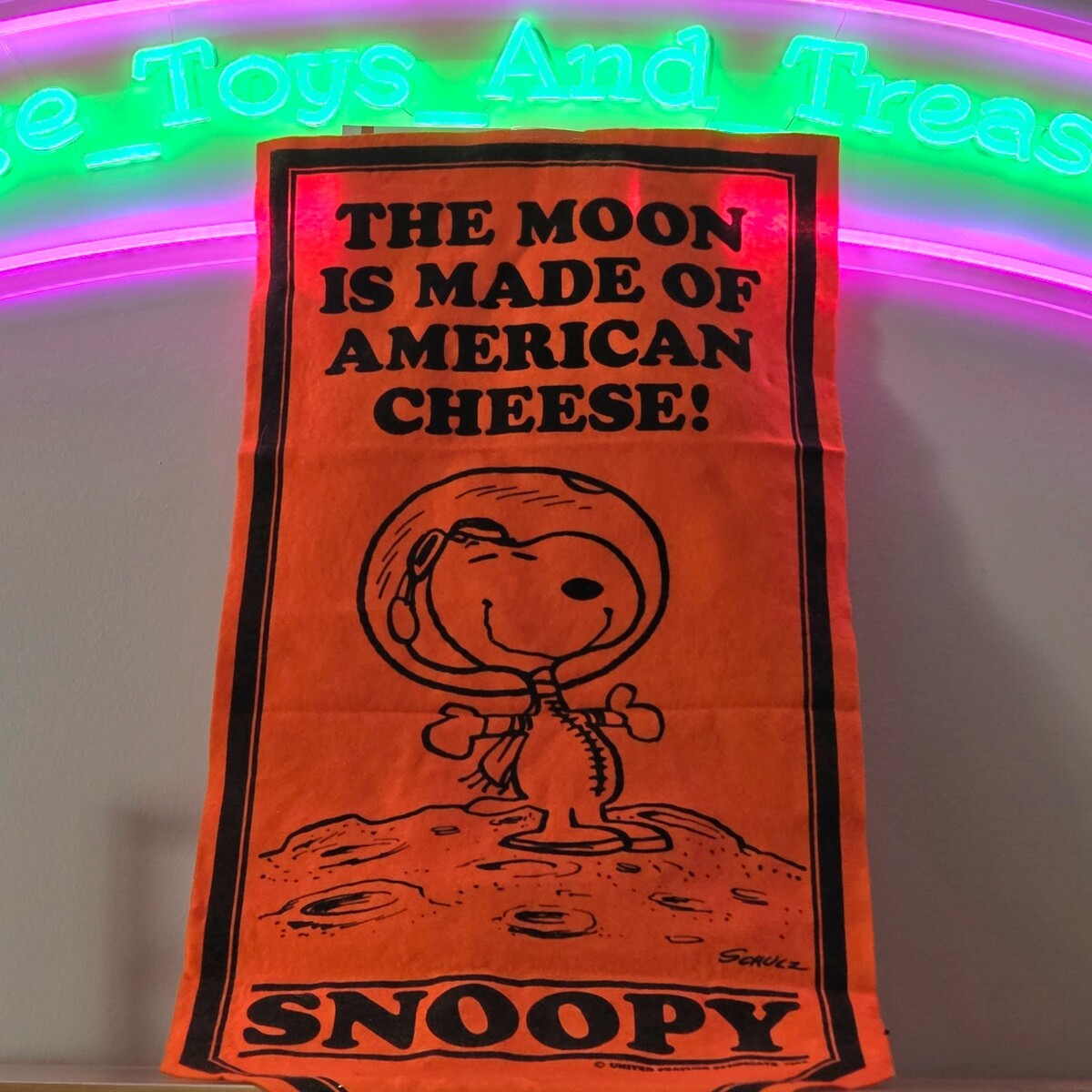 - VINTAGE 1969 THE MOON IS MADE OF AMERICAN CHEESE SPACE SNOOPY ORANGE BANNER NEW