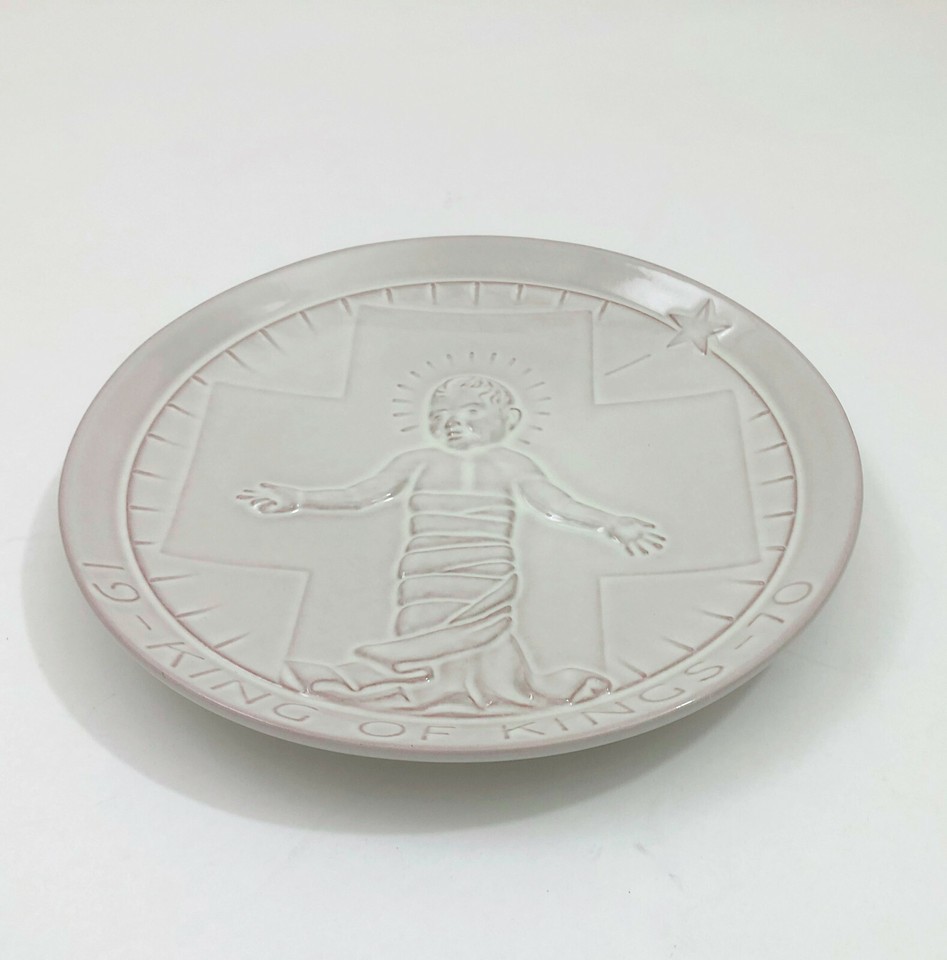 EUC, Frankoma 1970 "King of Kings" Baby Jesus decorative collectable beige plate designed and signed by JOhn Frank, founder of Frankoma Pottery. Pattery made in Oklahoma. In 1965, he made the first Frankoma Christmas collector plate. Each year a new Christmas plate was created. Upon his death in 1973, his daughter continued the tradition. Long history which finally changed when the factory was sold in 2012. As of approximately 2020, pottery continues to be made there but with a focus on art ware.