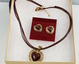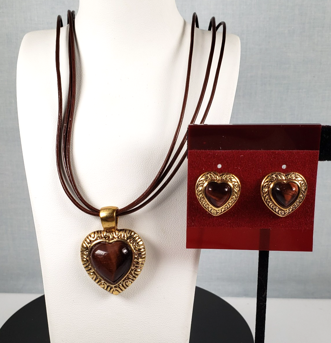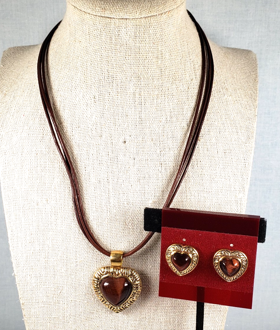 - Vintage 1970's Roman Tiger Eye Heart Pendant Necklace with Pierced Earring Set