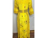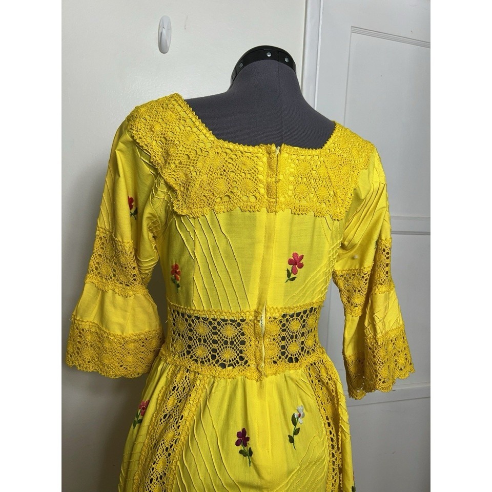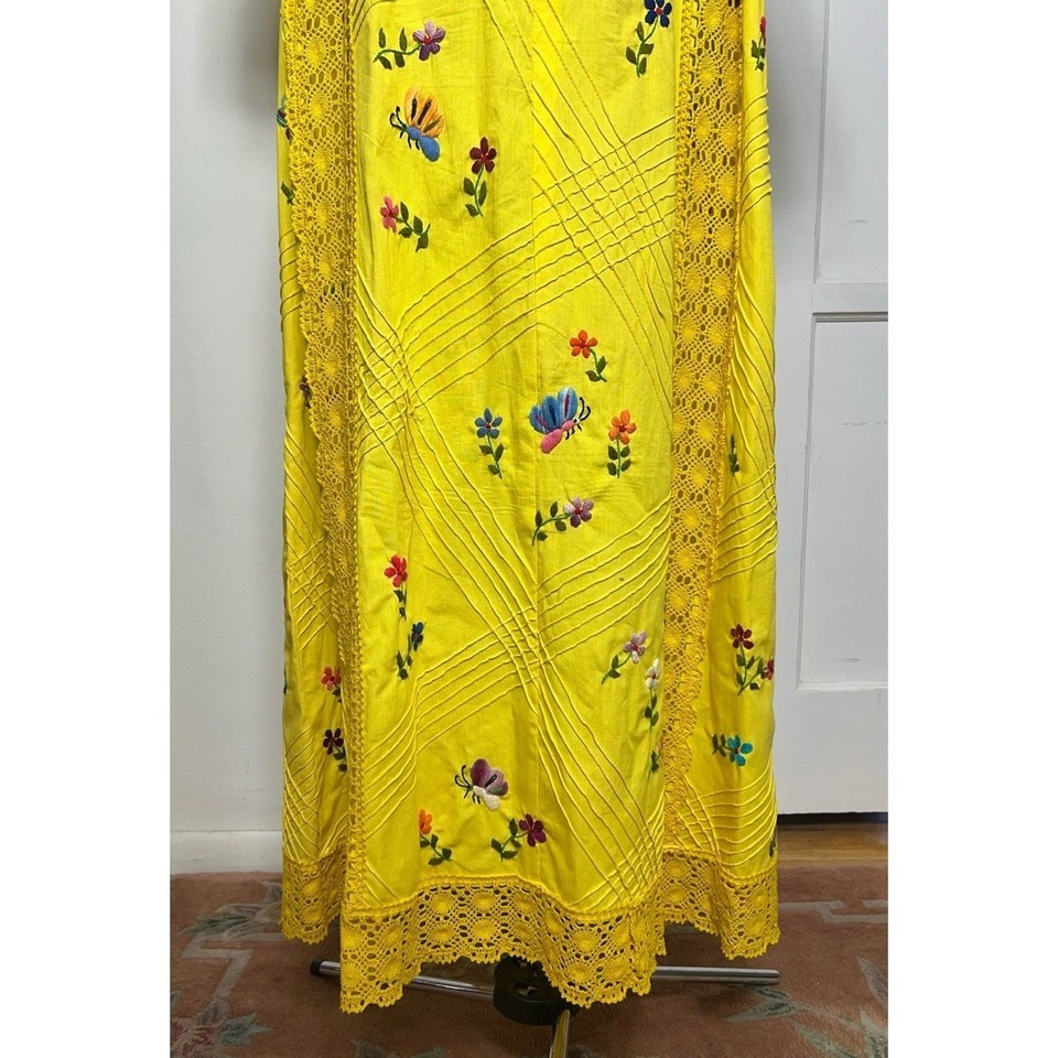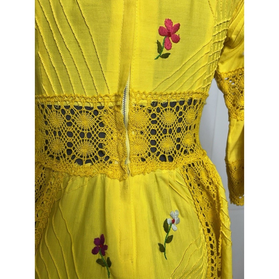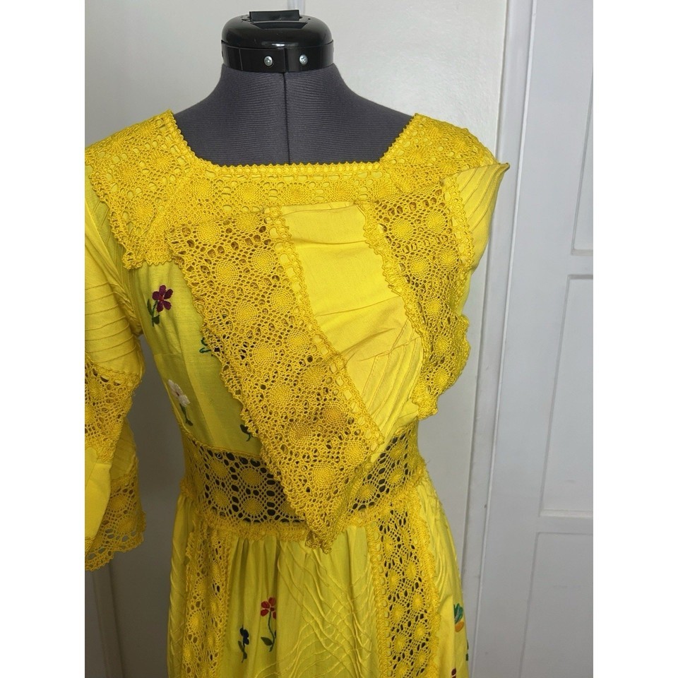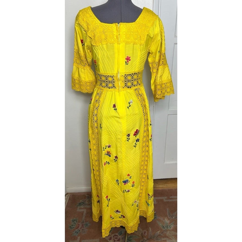 - Vintage 1970’s Yellow Lace Maxi Dress Embroidered Flowers Bees Boho Style Sz S