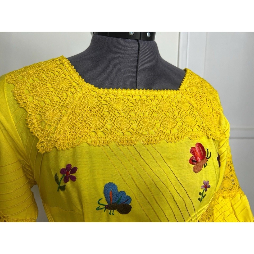 This gorgeous vintage 1970s maxi dress features vibrant yellow cotton with lace crochet panels, bell sleeves, and intricate embroidered flowers, butterflies, and bees. The lace sections are semi-sheer, adding a delicate bohemian touch.