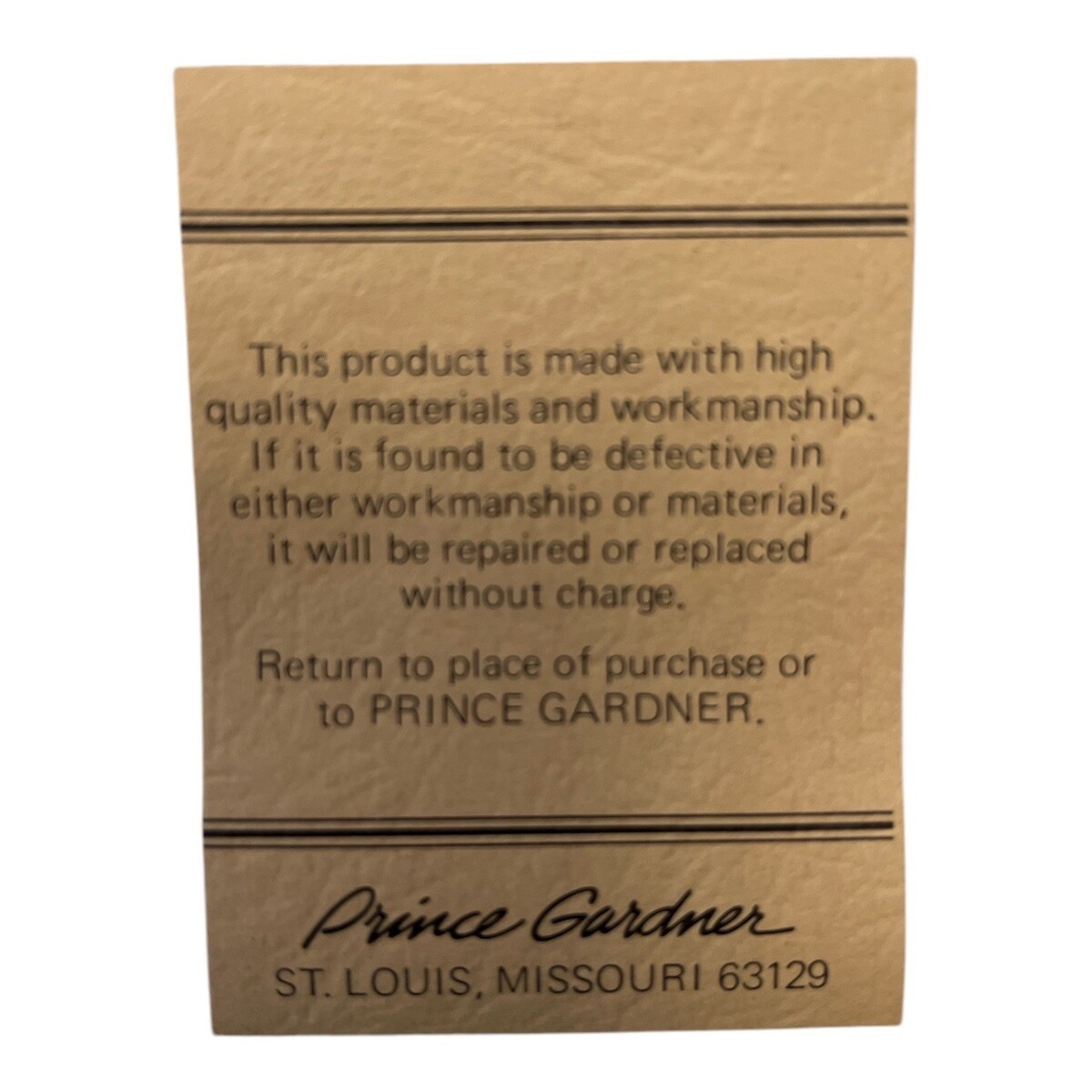Classic vintage Princess Gardner genuine leather wallet in a rich tan brown full-grain cowhide. Likely from the late 1970s to early 1980s, based on materials, logo style, and included inserts. Features a fold-over snap closure, built-in kiss-lock coin purse, card slots, checkbook holder, and original Prince Gardner paperwork including the ?Hint Dropper? card.