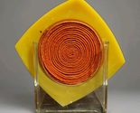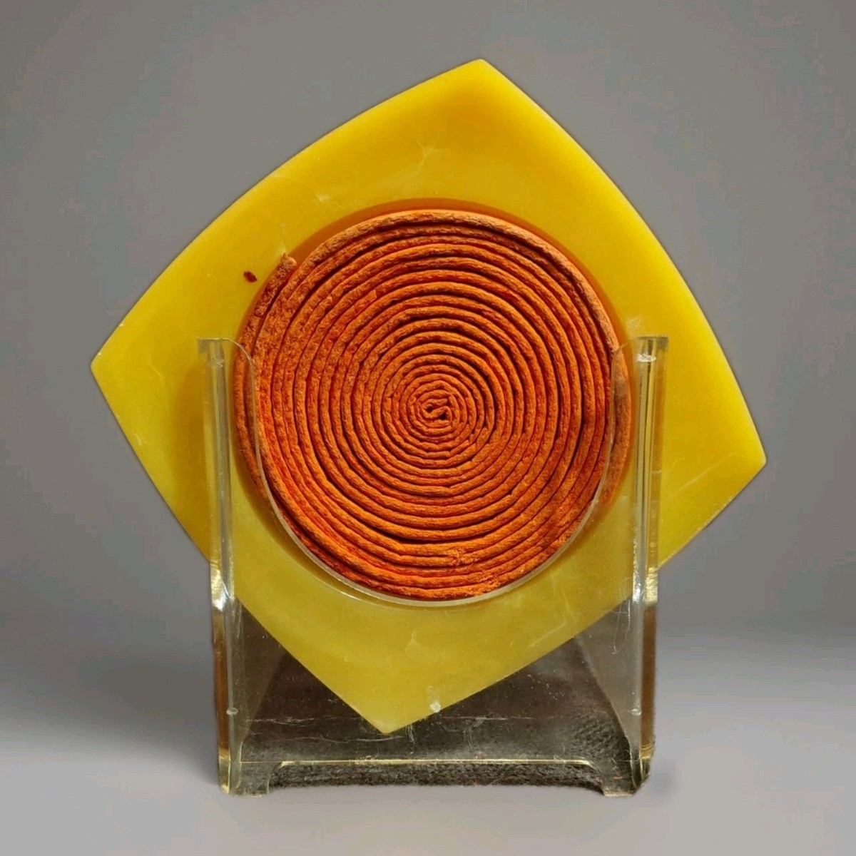This vintage MCM Lucite acrylic coaster set features a unique yellow color with a Shell Rope Coil design, typical of the Boho Tiki Retro style of the 1960s.