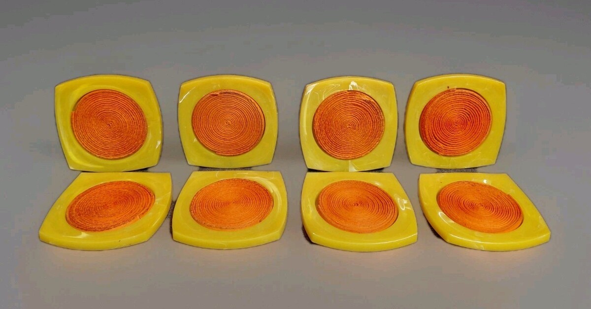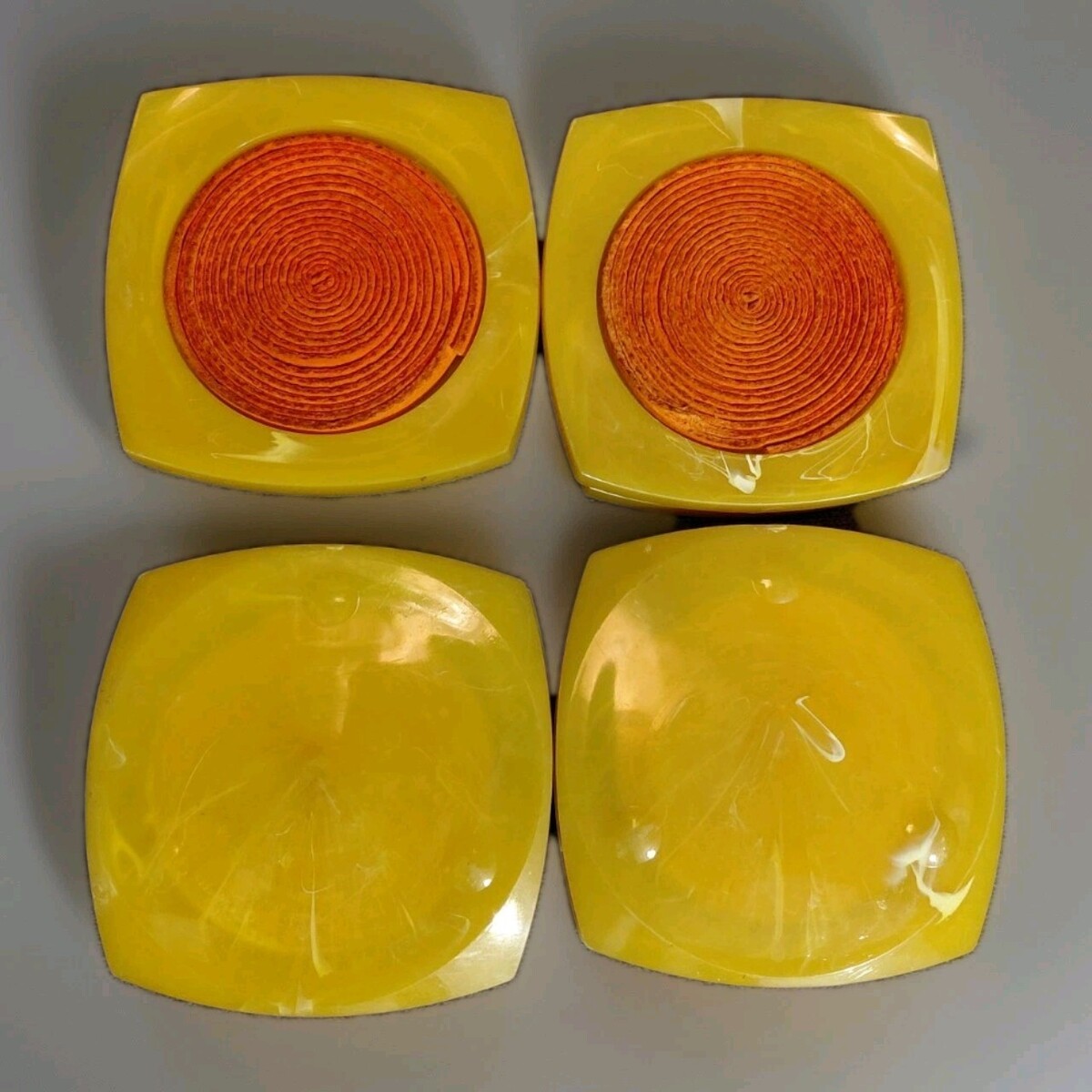 - Vintage 1970s MCM Lucite Acrylic Coaster Yellow Cellulose Swirl 8pc Set