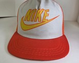 - Vintage 1980s Nike Trucker Hat Orange White Mesh Snapback Big Swoosh Logo