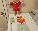 Vintage 1985 Coleco (1982) Cabbage Patch Kids Bald with Blue Eyes in a Red Sailor Outfit with socks and shoes. Includes Vintage CABBAGE PATCH KIDS Birth Certificate w/ Envelope for Wade Martin + Vintage Cabbage Patch Kids ?Fire Station? Romper with green and white striped pants.