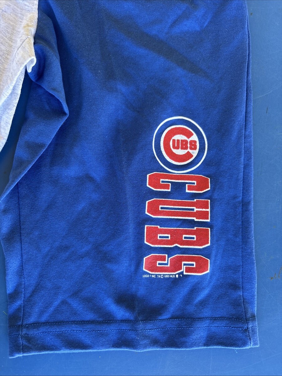 The product is a vintage pair of 1990s Chicago Cubs sweat shorts in youth size XL, featuring the official MLB team logo by Logo 7. The shorts are in a blue color and are gender-specific for boys who are fans of baseball and the Chicago Cubs team. These officially licensed sports apparel is a unique and nostalgic addition to any young fan's collection, perfect for showing support for the team both on and off the field.