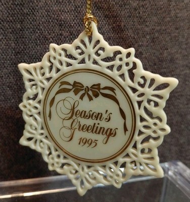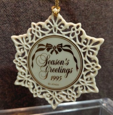 The product is a vintage 1995 Lenox Christmas flat style snowflake ornament from the Seasons collection.