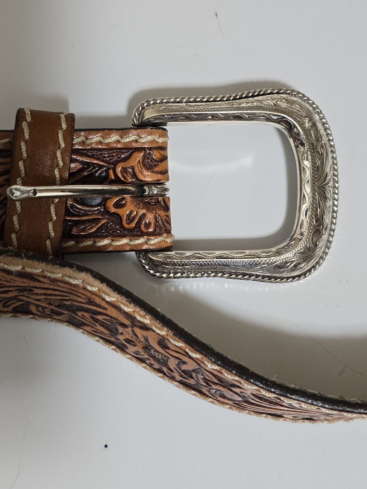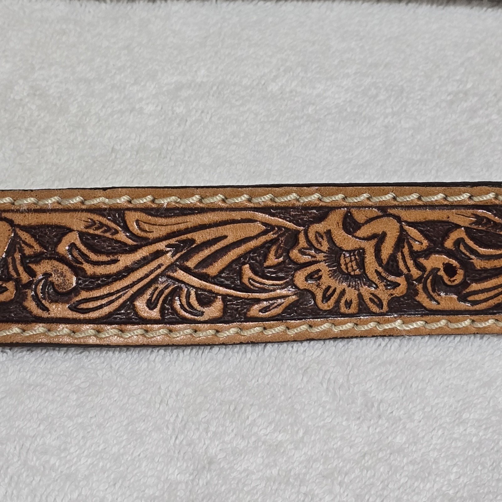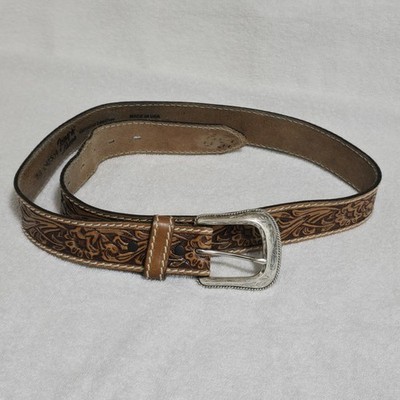 - Vintage 1995 Tony Lama Western Tooled Leather Belt Size 38 Floral Buckle USA