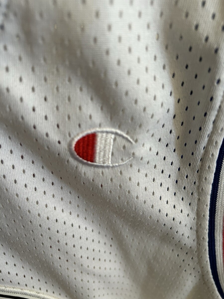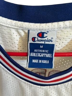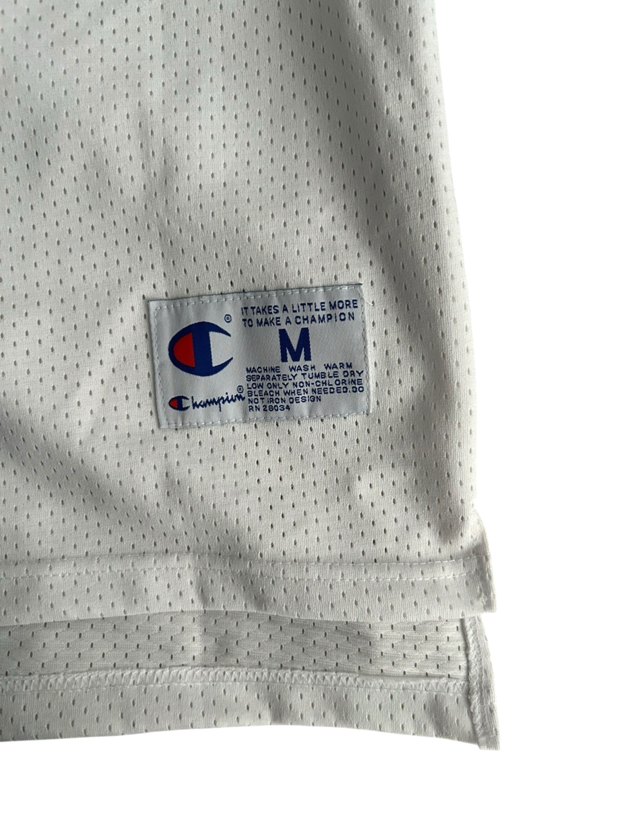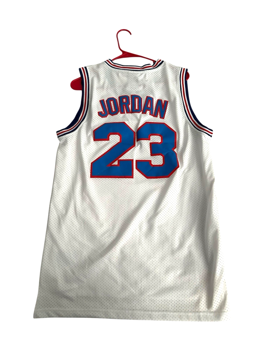 This product is a vintage 1996 Champion Tune Squad Space Jam Michael Jordan #23 Jersey in size medium. The jersey is officially licensed by the National Basketball Association (NBA) and features the iconic Chicago Bulls team colors of white. This classic piece of fan apparel is perfect for basketball enthusiasts looking to represent their favorite player and team in style. A great addition to any sports memorabilia collection, this jersey is a must-have for any Michael Jordan fan.