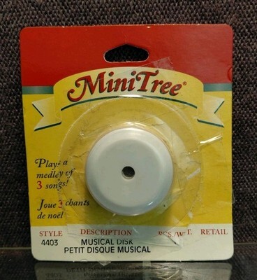 This miniature disk, manufactured in 1999, is designed to be placed on a tabletop tree and will play a festive tune when activated.