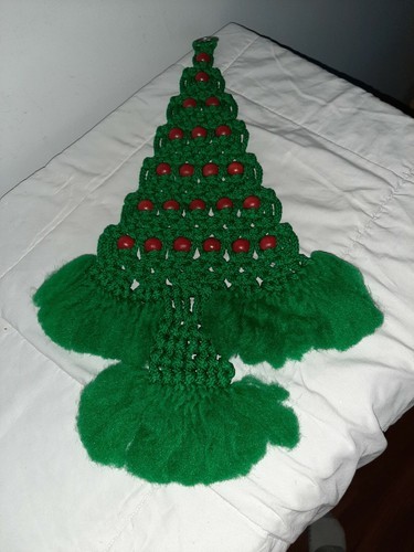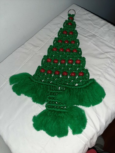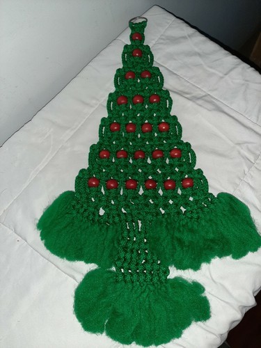 - Vintage 23" Macrame Christmas Tree Wall Hanging with Red Wood Beads Mod
