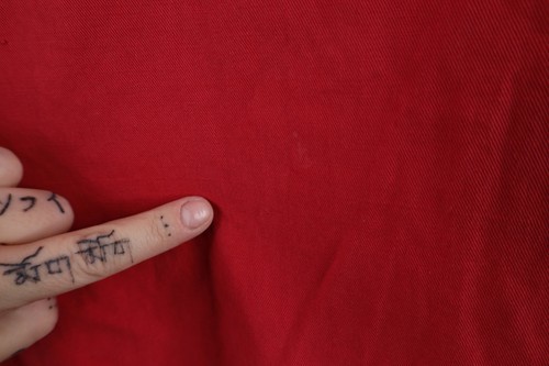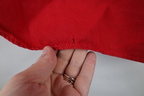 Loose threads/ripped seam around collar. Blemish middle back. Missing bottom button. Hole back bottom. Letters on back distressed. Color faded. USA made